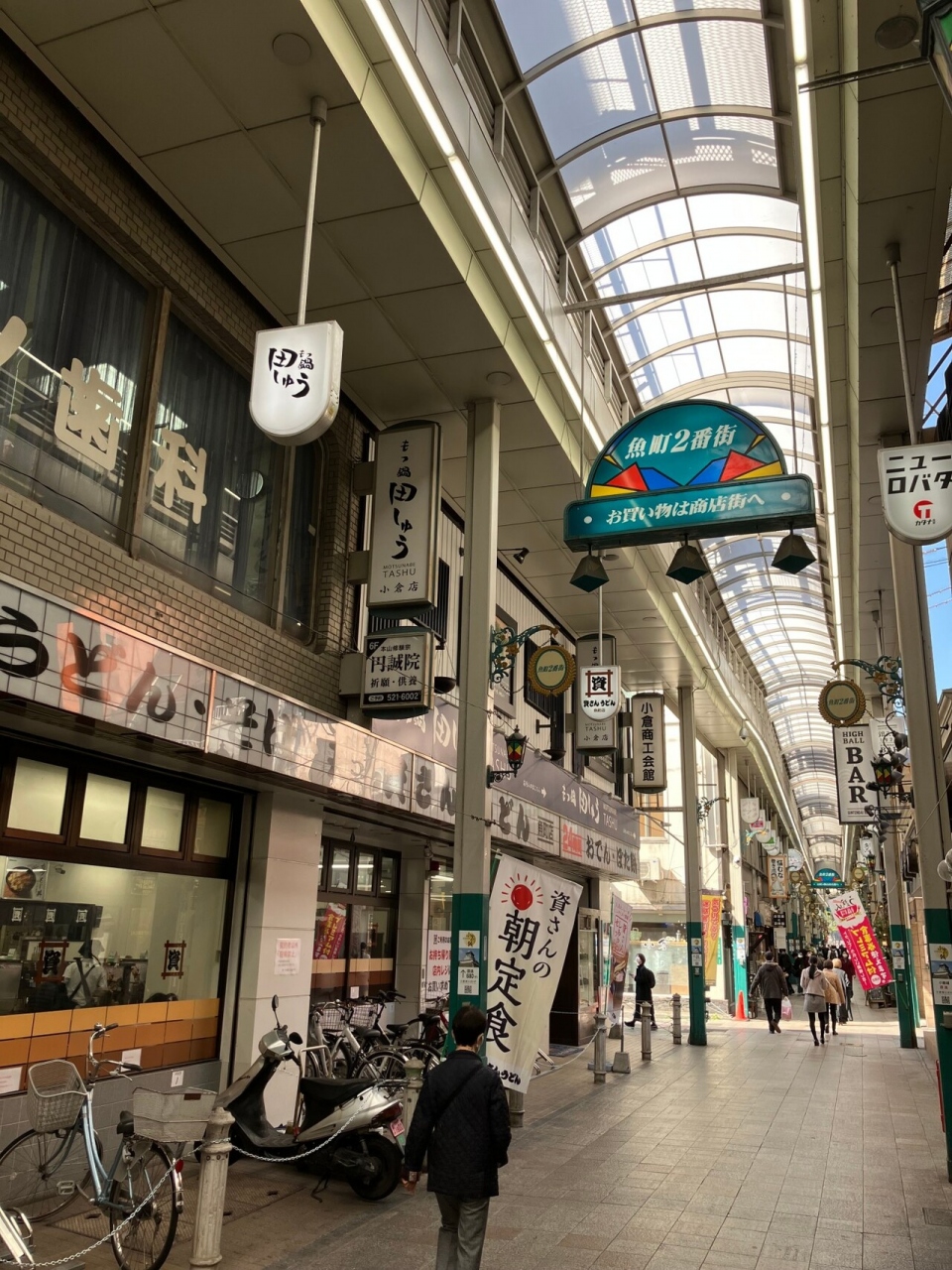 小倉にあるアーケード式の商店街です。日用品を調達するためのお店や、気軽に立ち寄れるカジュアルな飲食店が豊富にあります。人通りもまあまああってにぎやかな通りでした。