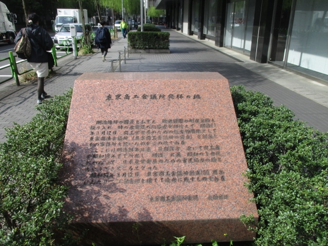 東京メトロ日比谷線東銀座駅改札出口から昭和通りと晴海通りの交差点渡りみゆき通りを築地方面に向かって進むと右手に植え込みの中に赤褐色の石碑がありました。明治時代に東京商工会議所が設置さ経済発展の原動力となっていたそうです。商工会議所の働きがもっとPRされて良いように感じました。立派な石碑ですがあまり目立たないのが残念です。