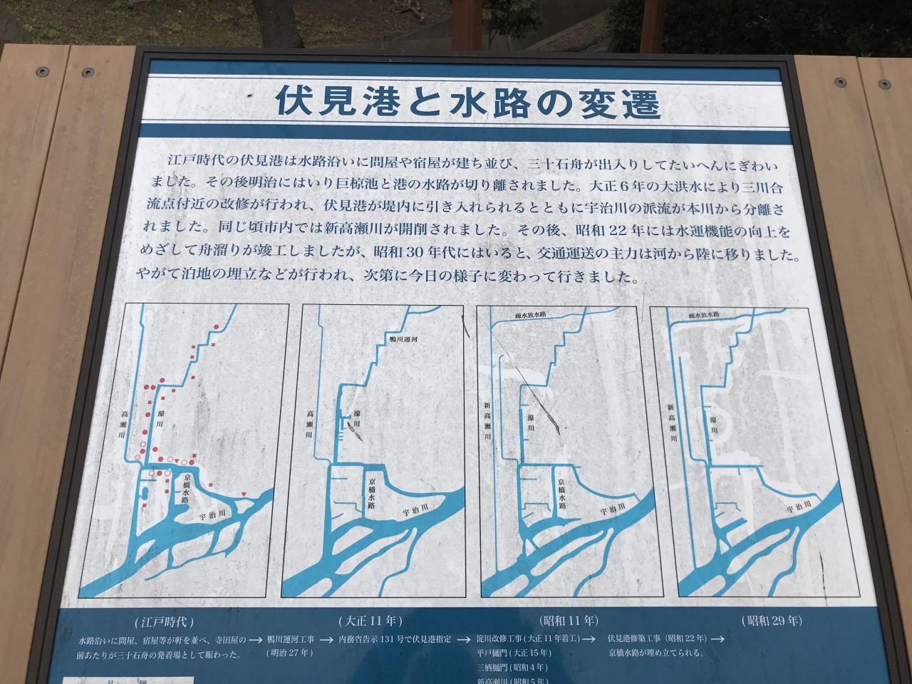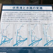 角倉了以水利紀功碑は、伏見であい橋を渡った濠川沿いにありました。角倉了以水利紀功碑の隣には「伏見港と水路の変遷」をいう説明板もありました。江戸時代に栄えた木屋町通の高瀬川から至る伏見港を作ったのが角倉了以公ですね。私が訪れた時には桜も満開だったので、石碑と一緒に記念撮影しました。