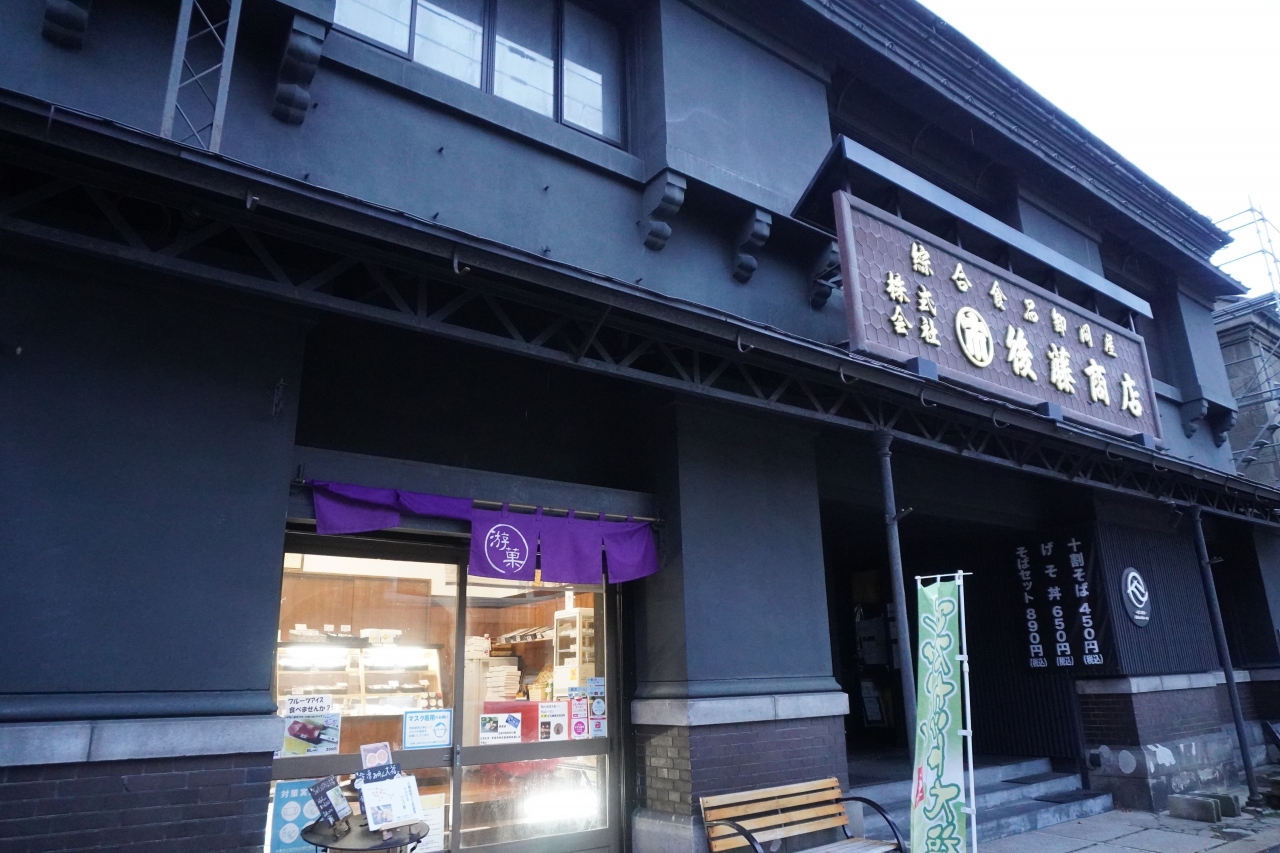 小樽では明治37年の大火の経験から防火構造の建物が普及したようで、この建物もその一つ。全体が真っ黒でいかにもといった感じですね。一階には海産物のお店が見えました。
