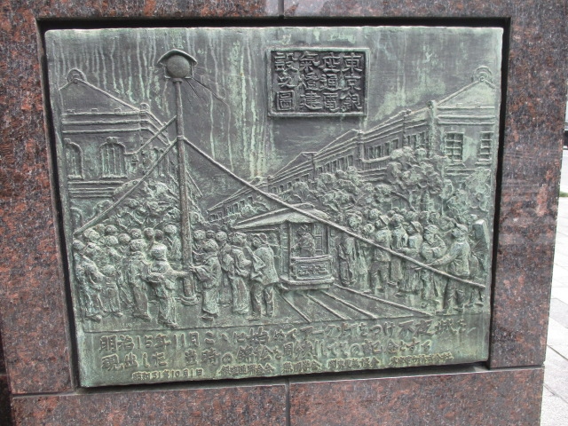 電気灯柱は中央通りにガス灯が登場してから10年足らずの1882年に銀座2丁目に2000燭光の街灯が点灯されたことを記念する日本最初の電気灯柱の記念碑です。カルティエビルの壁に埋め込まれた青銅色のプレートに初めてアーク灯が点灯されるのを見上げる人々の姿が刻み込まれていてにぎやかさが伝わってきました。当時の銀座の賑わいがわかりやすく描かれていました。中央通りと銀座マロニエ通りの交差点角にありました。