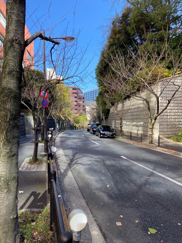 山王坂を下ってきて日枝神社の敷地の周りを沿うように北側から西側へとぐるりと下る坂です。こういった円弧状の坂というのも珍しいでしょうか。整然とした石垣は歴史は浅そうですが物量が多いので見応えがあります。休憩中なのかタクシーがたくさん停まっているのが気になりました。