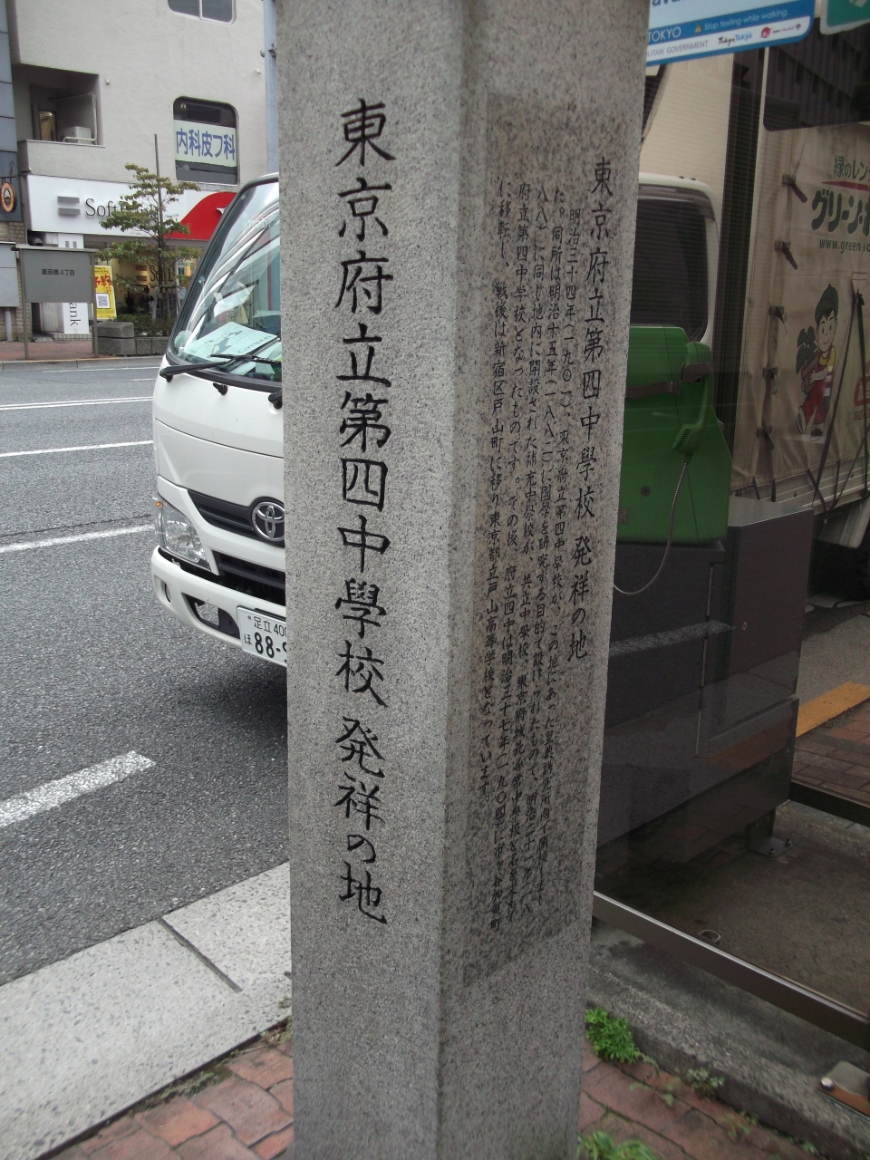 地下鉄東西線飯田橋駅を出るとすぐの、東京区政会館の前にこの石碑が建っていました。國學院大學の前身である皇典講究所の中に、明治21年に開設されたのが後の第四中学だそうです。明治37年には市ケ谷に移り、戦後は新宿区戸山に再度移転して現在は戸山高校になっています。