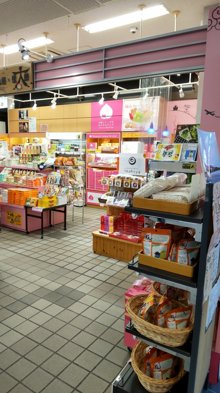 岡山桃太郎空港にある岡山県の名産品を多数取りそろえたギフトショップです。岡山桃太郎空港国内線ターミナルビル1階にあります、見た目はコンビニエンスストアみたいですが、店内は岡山県名産品だらけ、お酒もたくさんで酒好きにはたまりません