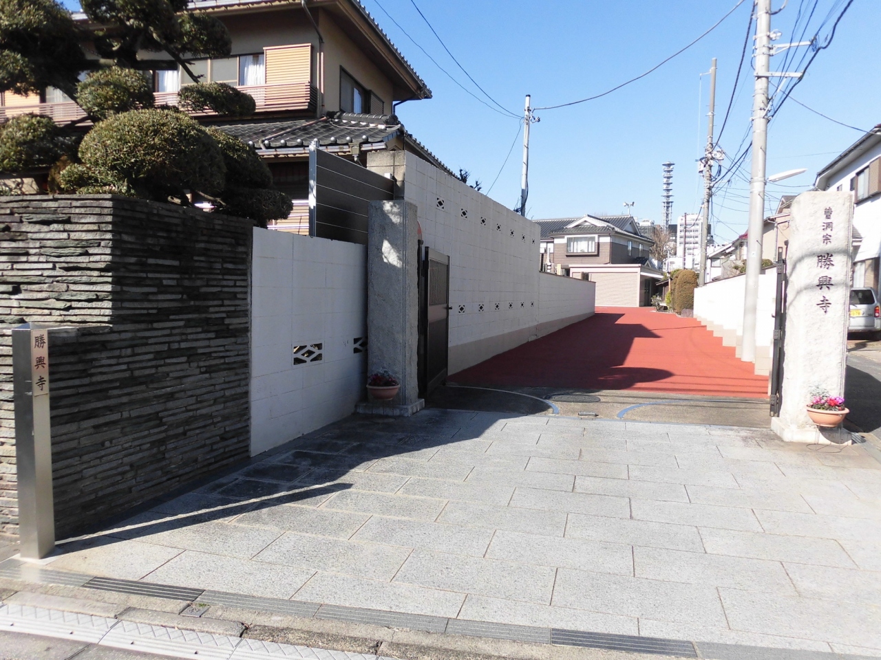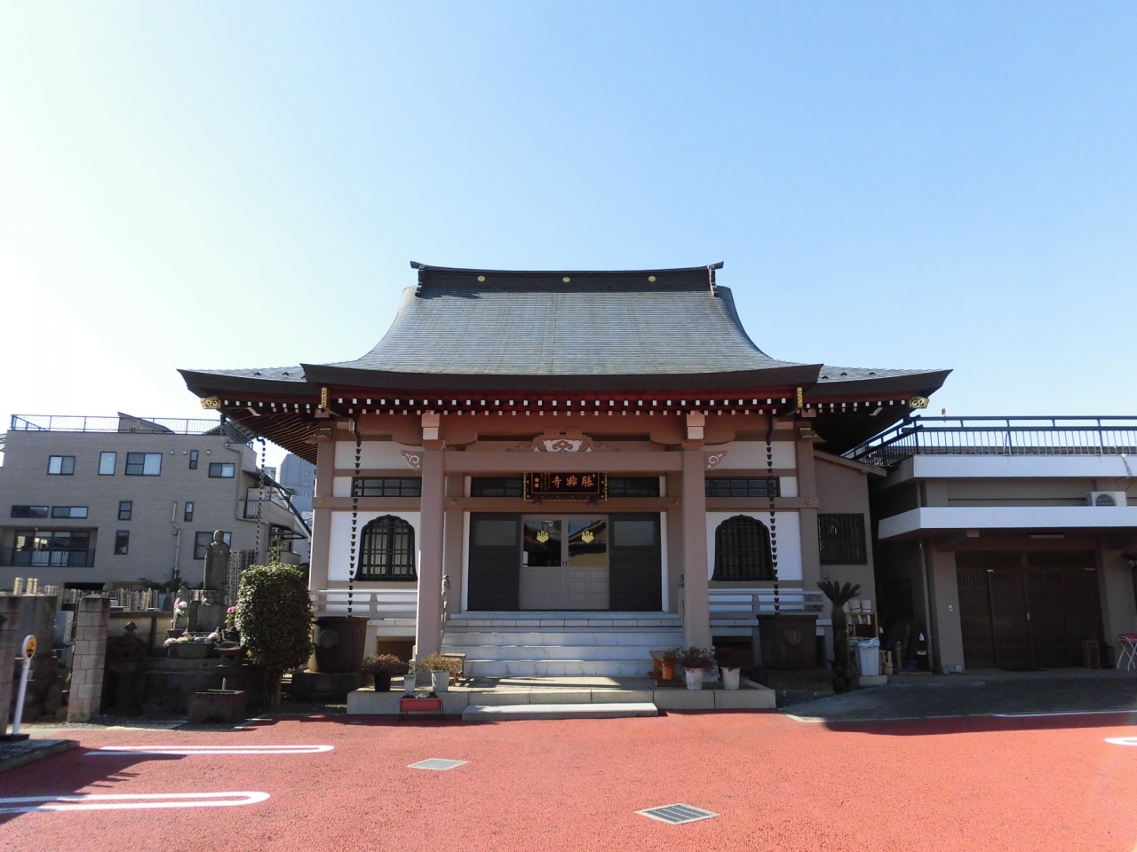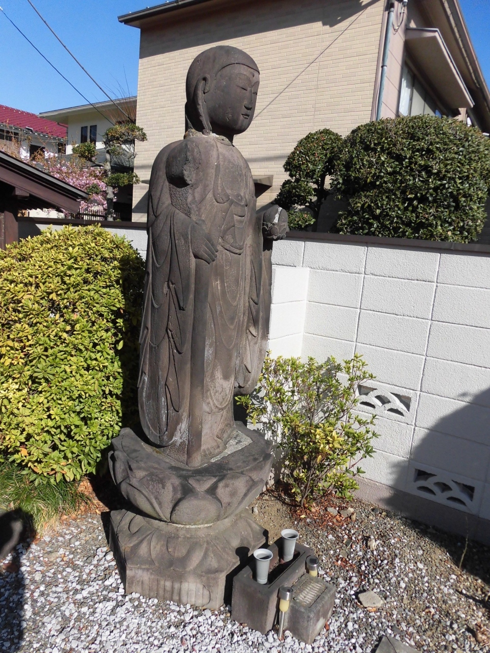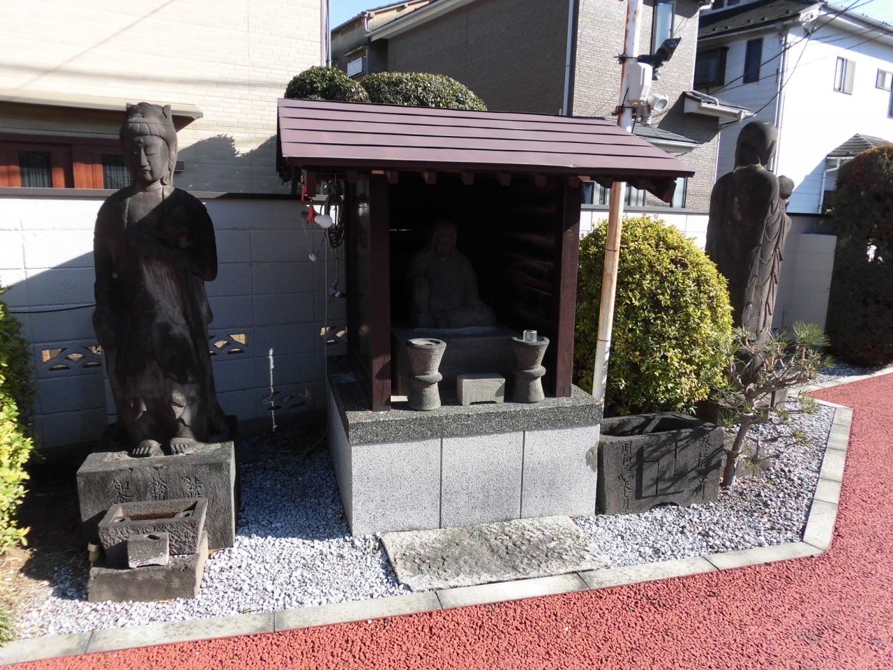 このお寺の特徴として、門から境内に続く参道や、本堂前の敷地の舗装色が赤いレンガ色なのが鮮やかでした。本堂はコンクリート聖で歴史的な古さは感じられません。境内には地蔵尊などもお祀りしていますが、木々が少ないのでどこか閑散とした感じのお寺でした。