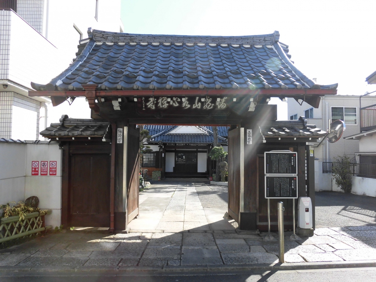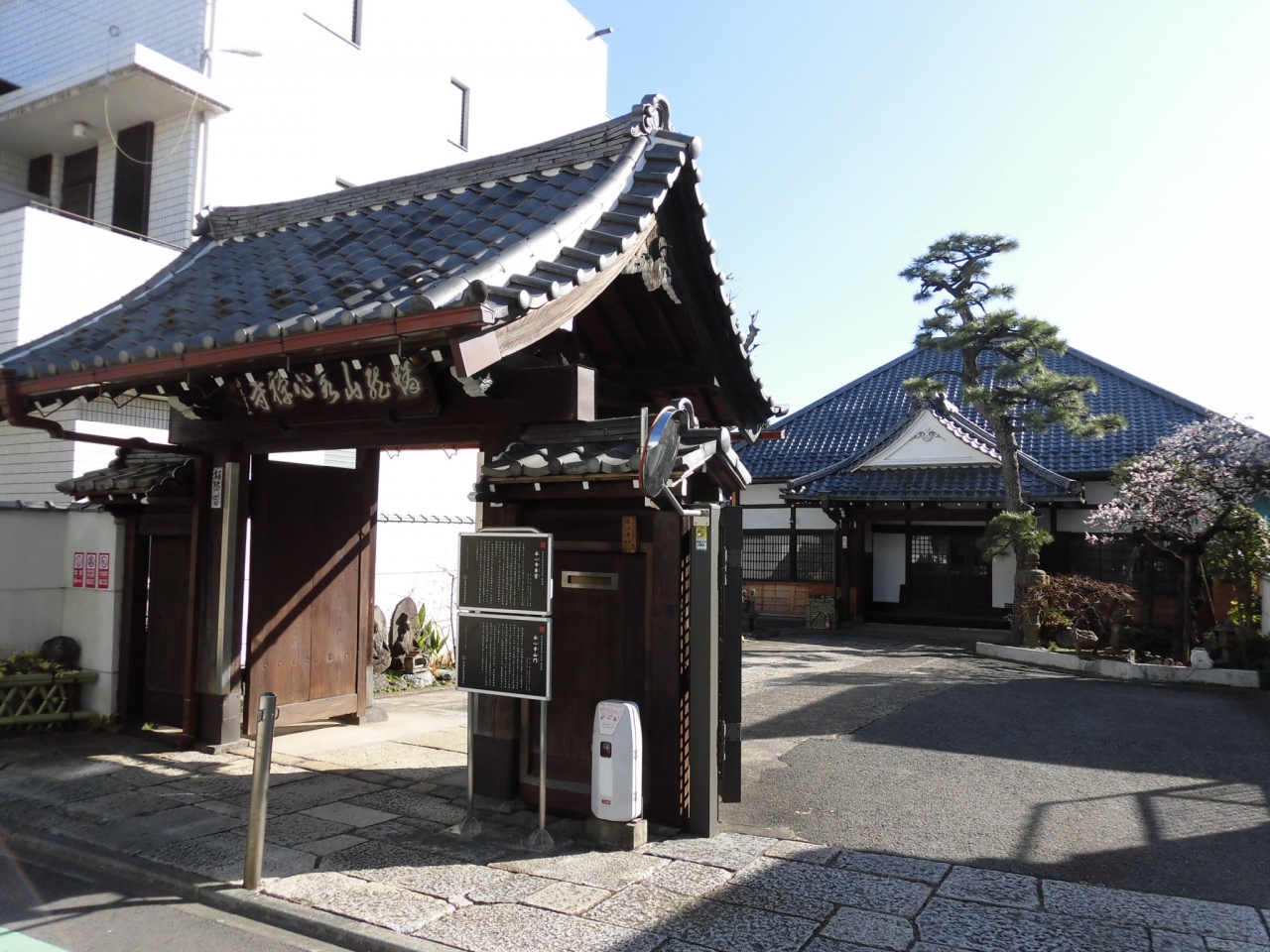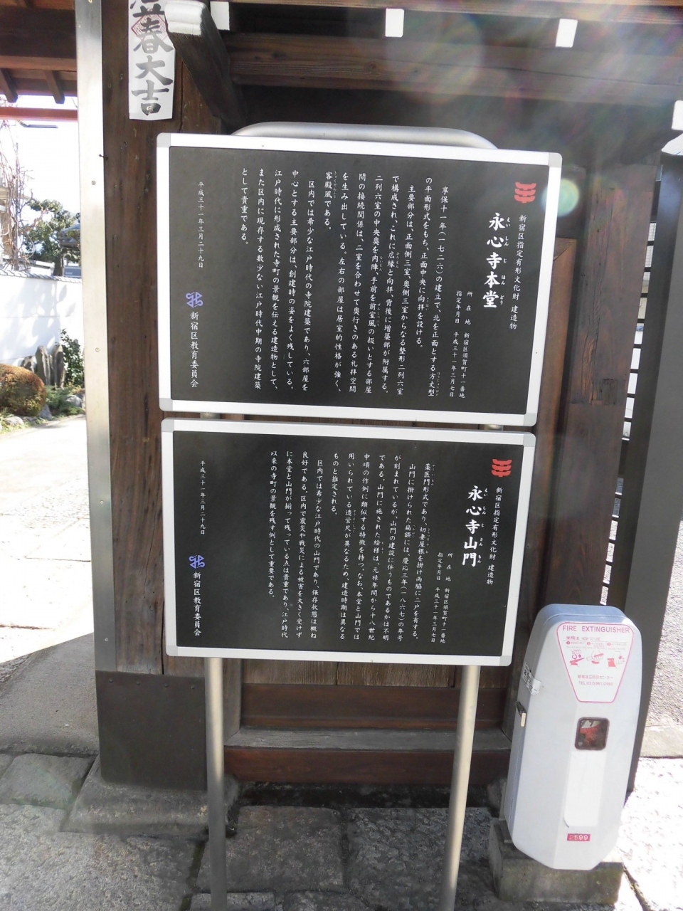 新宿の須賀町には、軒を連ねるようにお寺があって、このお寺もそのうちの一つです。山門や本堂は新宿区の指定有形文化財になっているようで、確かに歴史の重みが感じられる瀟洒で素敵な建物だと思いました。ただ、山門に続く寺塀の片側が、切り取られたようになっていて、せっかくの雰囲気が損なわれてるような感じでした。
