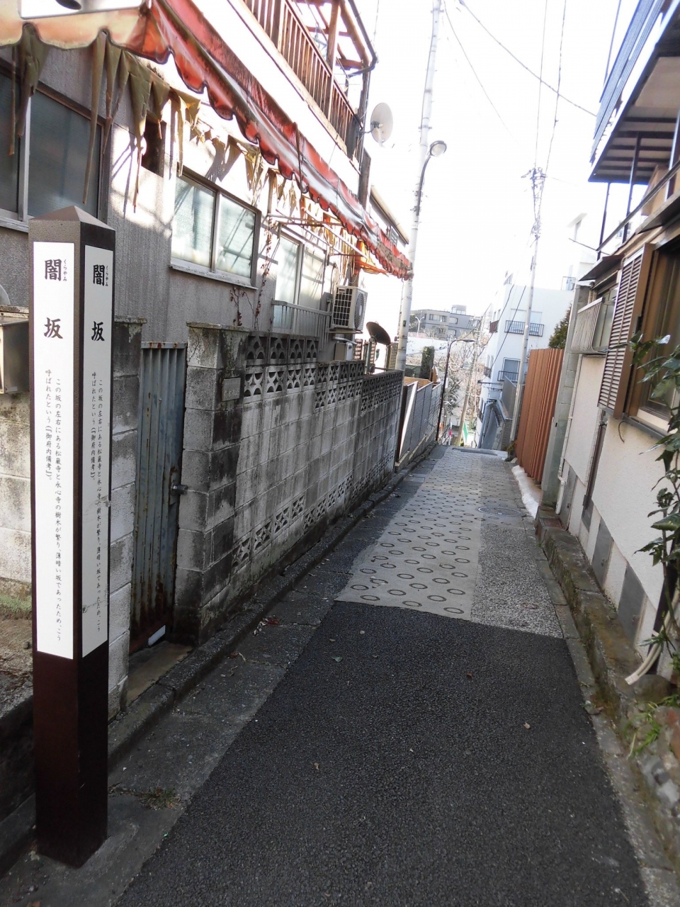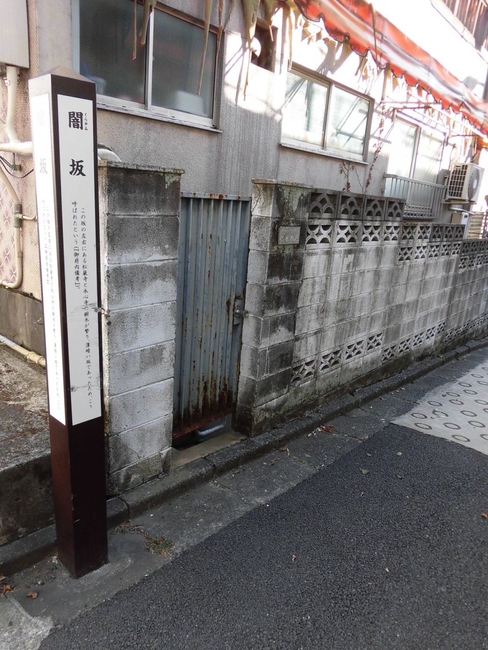 新宿区須賀町近くで通った坂道です。細い路地のようになっていて、それなりに勾配もあって急な坂道でした。現在は民家に挟まれた狭い道になっていますが、おそらく昔はうっそうとした木々の中にあって、夜にはその名の通り暗闇で怖かっただろうと想像が膨らみました。