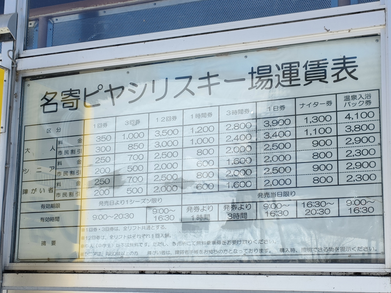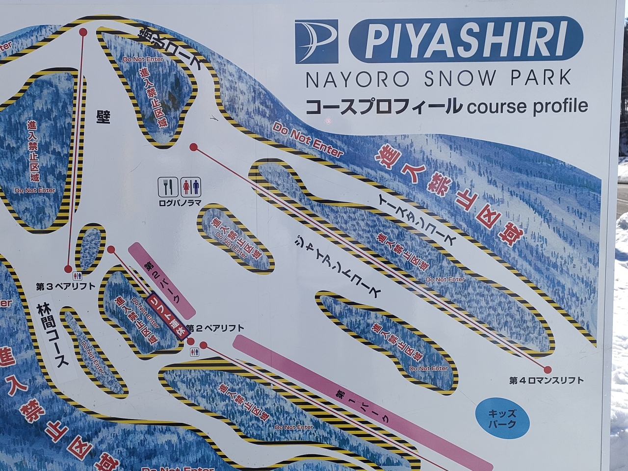 ピヤシリと名が付いていますが、実際にはピヤシリ山(標高987m)の麓、標高673.8mの九度山にかかるスキー場で、麓に温泉ホテルがあるほか、ホテル前まで名寄駅ほか市街から1日6本、無料のバスが出ています(2023年)。リフトは1回¥350円、1日券は¥3900円ですが、温泉パック券が¥4100円で、日帰り入浴料¥500を別払いするよりは良いと思います(2022シーズン。有効時間に注意)。