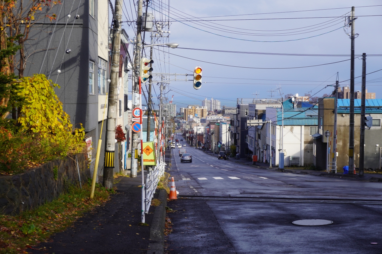地獄坂は、旭展望台に行くのに通りました。小樽商科大学へ向かう約1.5Kmの長い坂道の小樽商大前バス停で降りて、そこからは歩いて旭展望台まで。帰りは地獄坂を歩いて下りました。さほど急な坂道ではないような気もしますが、やっぱりそれなりに長いのでここを歩いて上るのはけっこうきついでしょう。最後のところ、一直線になって市街に下りていく感覚がちょっと印象に残りました。