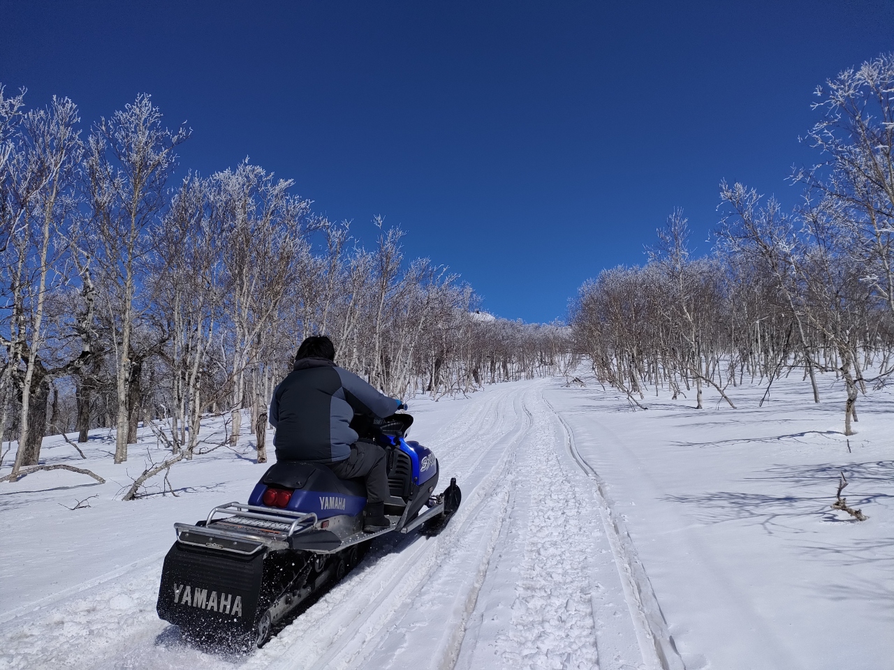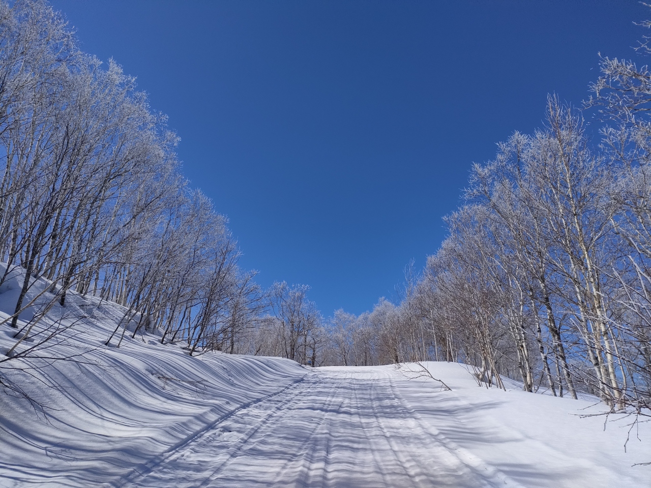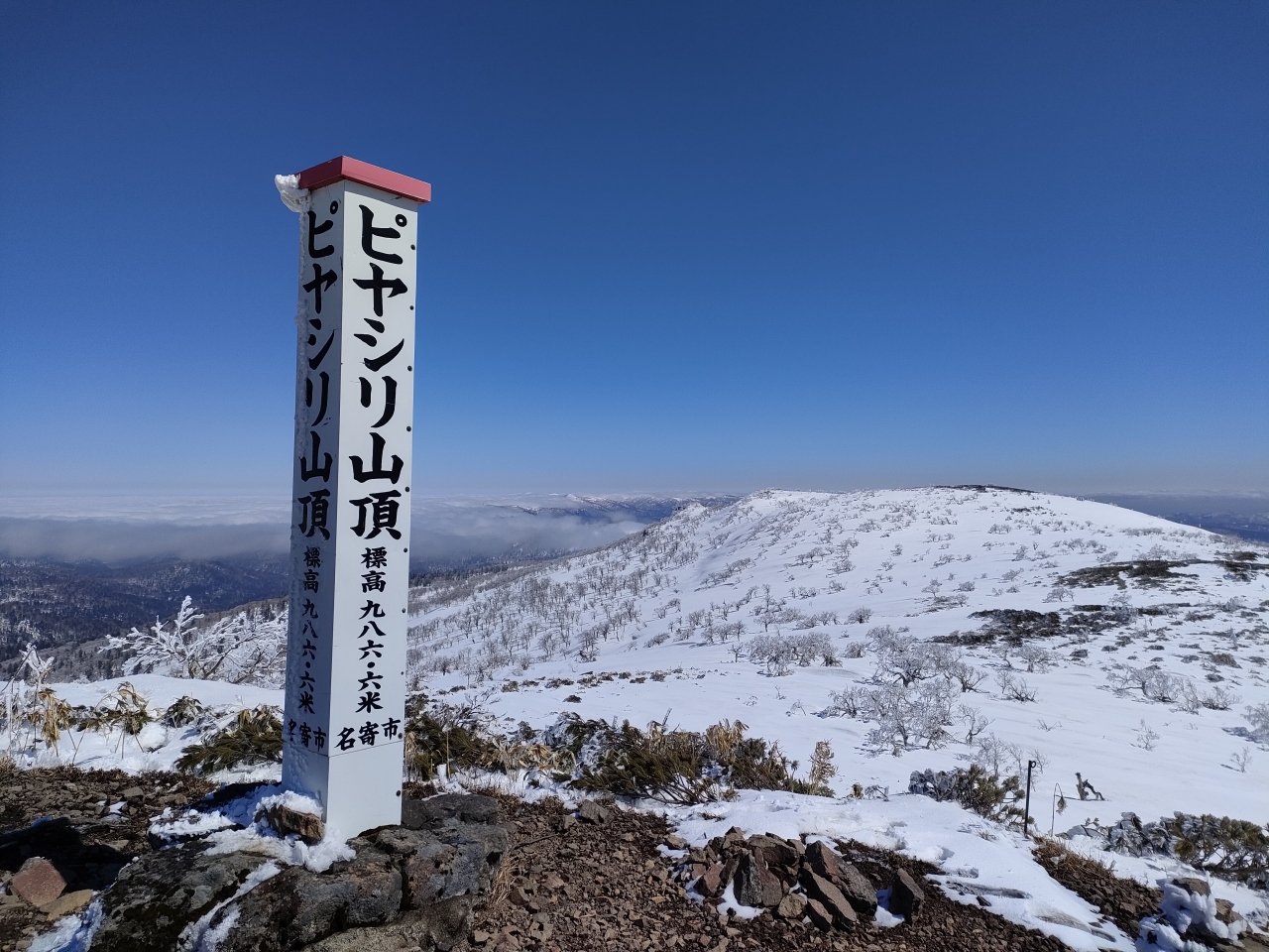 標高987mのピヤシリ山は、宗谷丘陵の氷河地形から連なるせいなのか分かりませんが、比較的緩やかな山容で、コース外滑降が禁じられているピヤシリスキー場よりも、気楽に樹氷に巡り合うことができます。スキー場の奥から山頂手前2km(登山口)まで、できればオフロードが良いと思いますが、約10kmの林道が続いていて、夏なら標高782m地点の登山口まで車で行くことができますが、雪の積もる冬場は、勿論、進入禁止…というか、物理的に不可能です。そのため、¥12,000円かかりますが、名寄観光協会(駅前のよろーな内)でやっているスノーモービルツアーに参加すると爽快感あふれる登山を楽しめそうです(2022-23年冬期)。