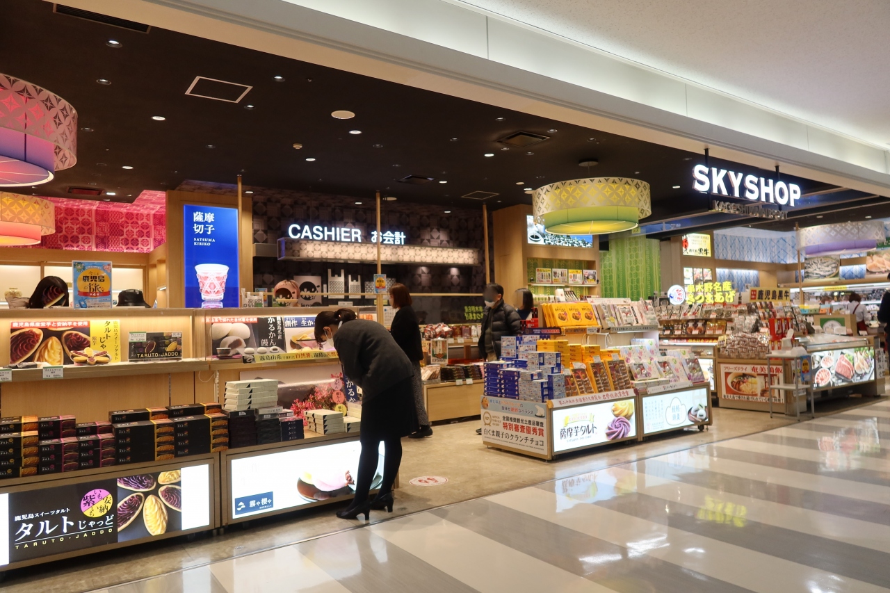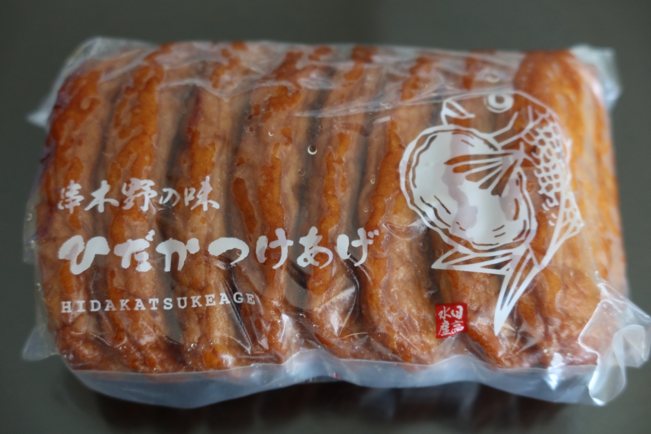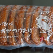 鹿児島空港の国内線2階、出発ロビーの検査場の前辺りにある土産物店です。軽羹やきんつば等の銘菓から、黒毛牛肉、焼酎、また薩摩切子等の工芸品など多種のお土産が揃っています。こちらで購入したのは「ひだかつけあげ」というさつま揚げ。串木野のさつま揚げで、ちょっと甘い味付けが変わっていました。