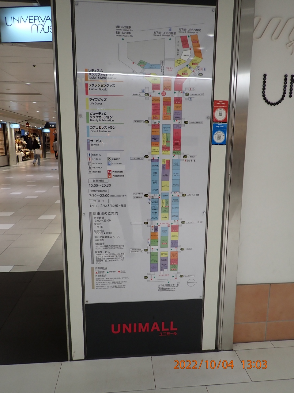 名古屋市観光で立ち寄りました。ユニモールは、JR名古屋駅から東に地下鉄桜町通線に沿った延びてました。GATEWALKの先から7ブロックのゾーンに分かれており、イーストプラザの所で終わってました。非常に多くの店舗が入っている大きなショッピンモールです。
