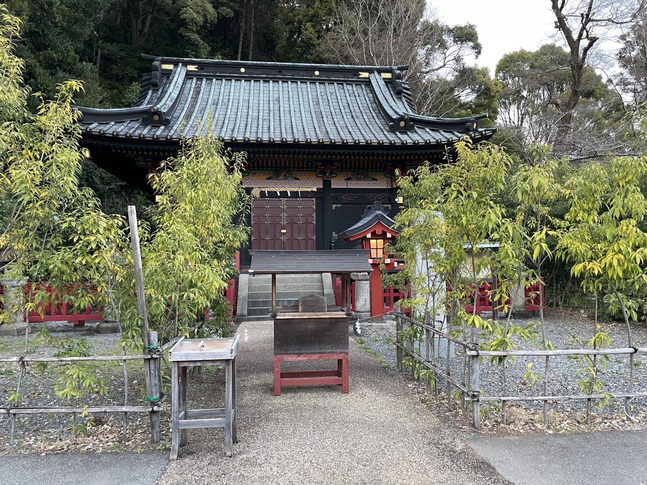 静岡浅間神社の境内社の一つで、病気治癒・健康安全など医薬に御利益があることで有名です。場所は浅間・神部神社の本殿の外側にあります。入母屋造りの社殿に銅瓦が乗っています。社殿壁面の黒と朱塗りの欄干や灯籠は定番の色合わせ。さらに社殿正面の戸は茶色をアレンジしてありました。浅間神社の散策は各境内社の色彩感も注意して観ると楽しみが増しますよ。