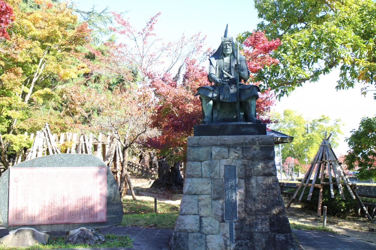 上杉神社にある謙信公の像は勇ましい姿を私たちに見せています