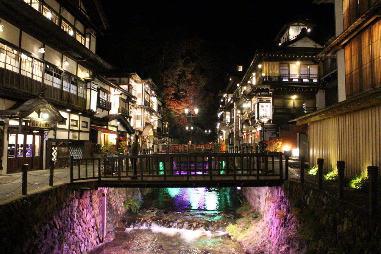 雪の積もる銀山温泉に宿泊しゆっくりと写真を撮りたいと長年思っていたが雪道の運転は雪のない地方の私たちでは無理なので今回日暮れが早い秋に行きました
