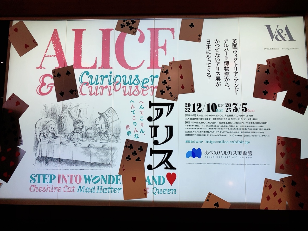 あべのハルカス美術館に行くこと自体が初めてだったのでちょっとワクワクしていきました。 2022年12月~3月までの企画展で、私は2月の平日の夕方に行きましたが、それなりに人はいました。 平日夜割引が使えて、前売り券とほぼ同じ1600円で入れたのはラッキーでした! 不思議の国のアリスと言ったら、ディズニーのアニメが有名ですが、こちらの展示は、ルイス・キャロルが即興で創作した話がもとになり1865年に誕生した、普段は英国のヴィクトリア・アンド・アルバート博物館に行かないとみることが出来ない貴重な展示を見ることが出来ました。