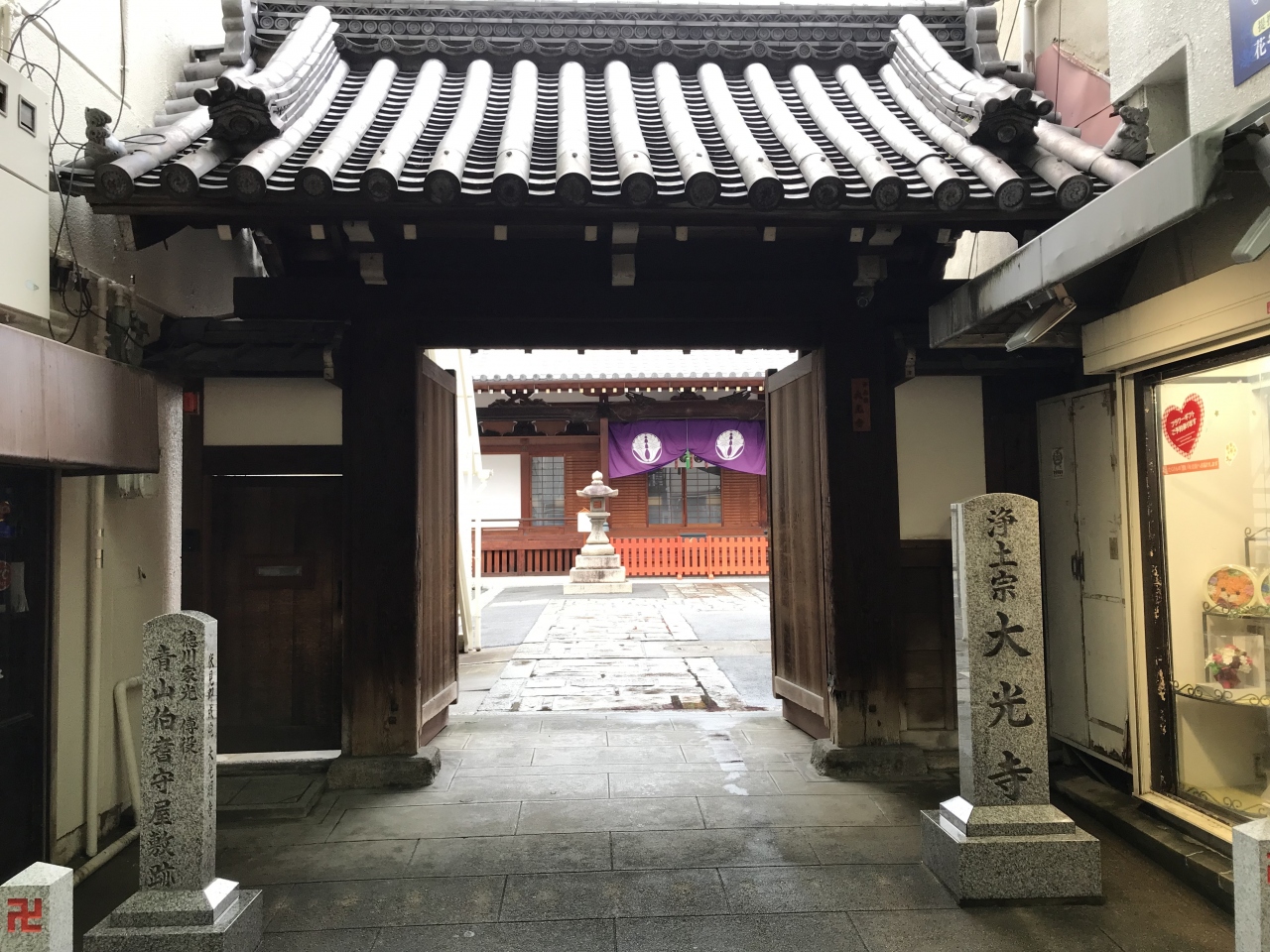 大光寺は、伏見大手筋商店街にある浄土宗の寺院です。大光寺(元大光明寺)は、鎌倉時代に空蔵坊寛海上人によって開基されました。商店街側に立派な山門がありました。元々は伏見桃山町松平武蔵にあり、後に伏見奉行所 小堀遠州によって伏見城大手筋門通りの地である家光傅役 青山伯耆守屋敷跡地に移転したようです。山門脇にはそれを示す石碑もありました。幕末には伏見義民一揆や新選組に関係する事件などもあり、伏見の歴史に深く関係した古刹だそうです。