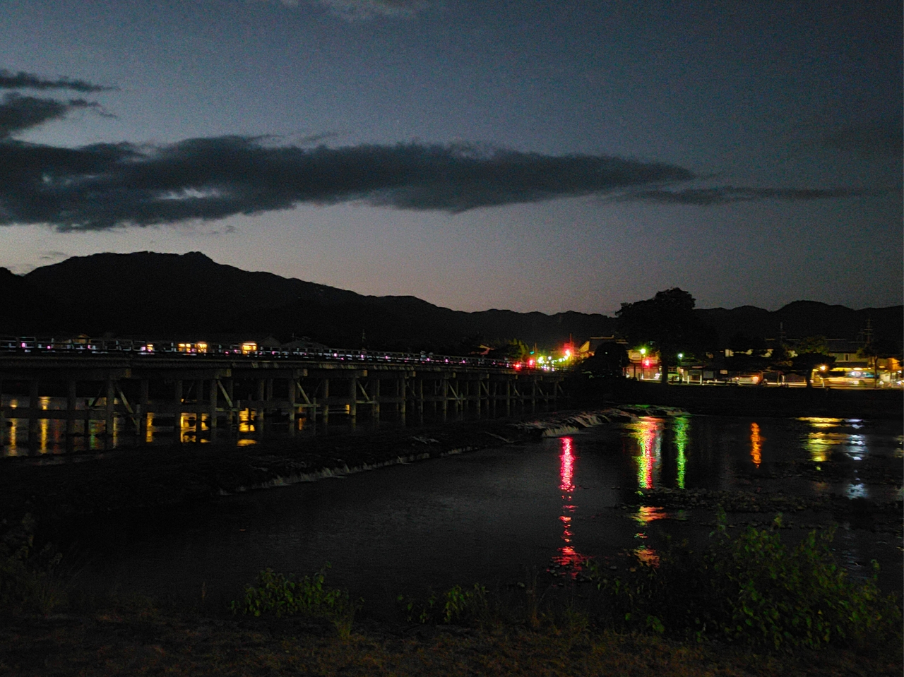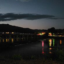 嵐山を流れている川で、有名な渡月橋が架かっています。けっこう川幅があり、流れはわりと緩やかかと思います。日が暮れた後でしたが、嵐山公園の河川敷に座って川のせせらぎを聞きながらのんびりしている人がたくさんいました。