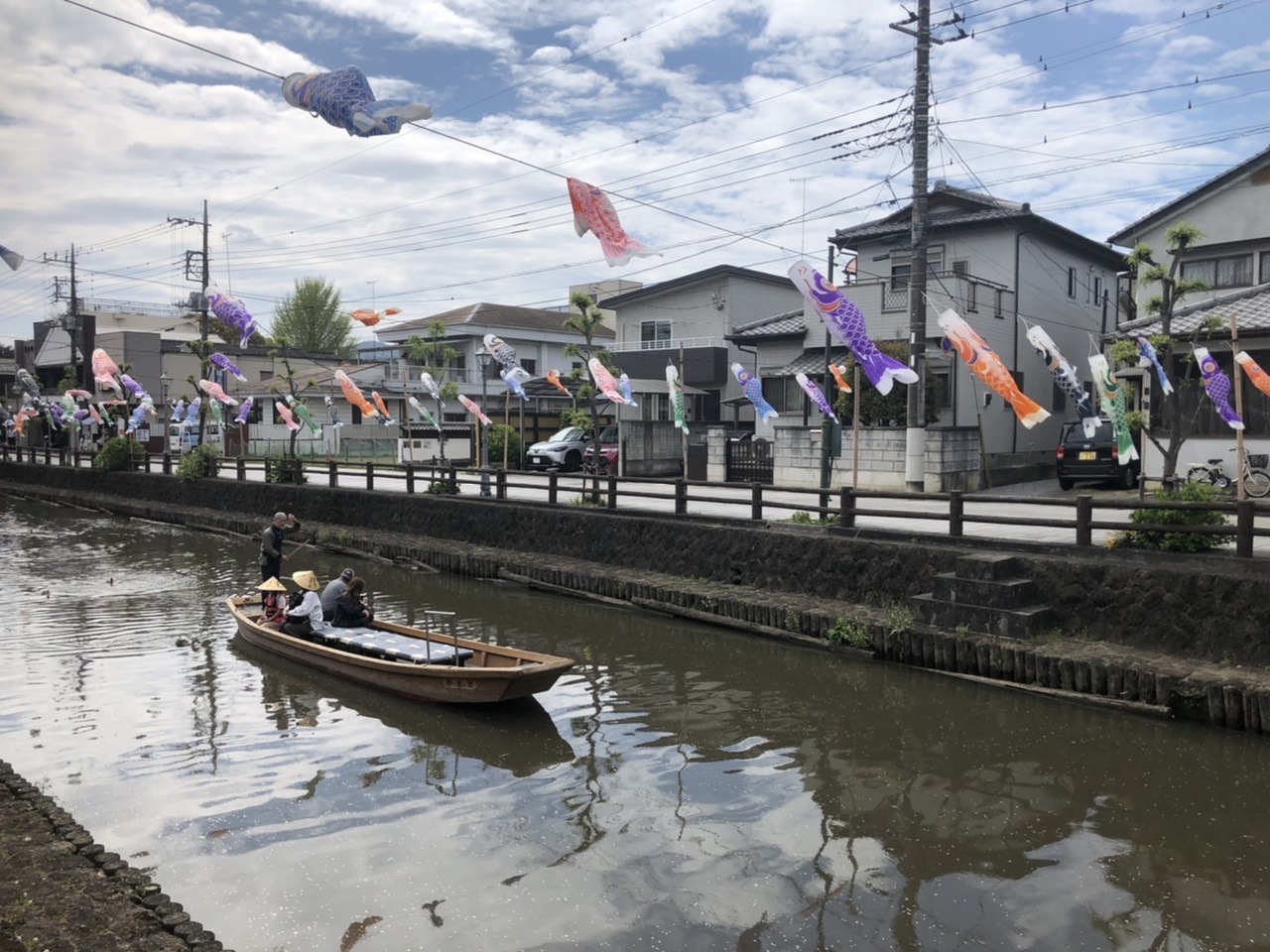 巴波川を、船頭さんが、オールを漕ぎながら、行き来してくれます。栃木の蔵の街の歴史を紹介してくれたり、歌を歌ってくれたりします。今の季節は、巴波川の上に、いろいろな色の鯉のぼりが飾られていて、それも楽しめました。