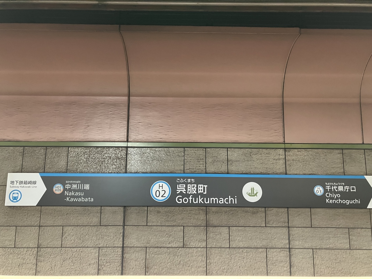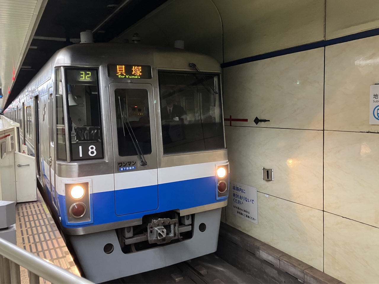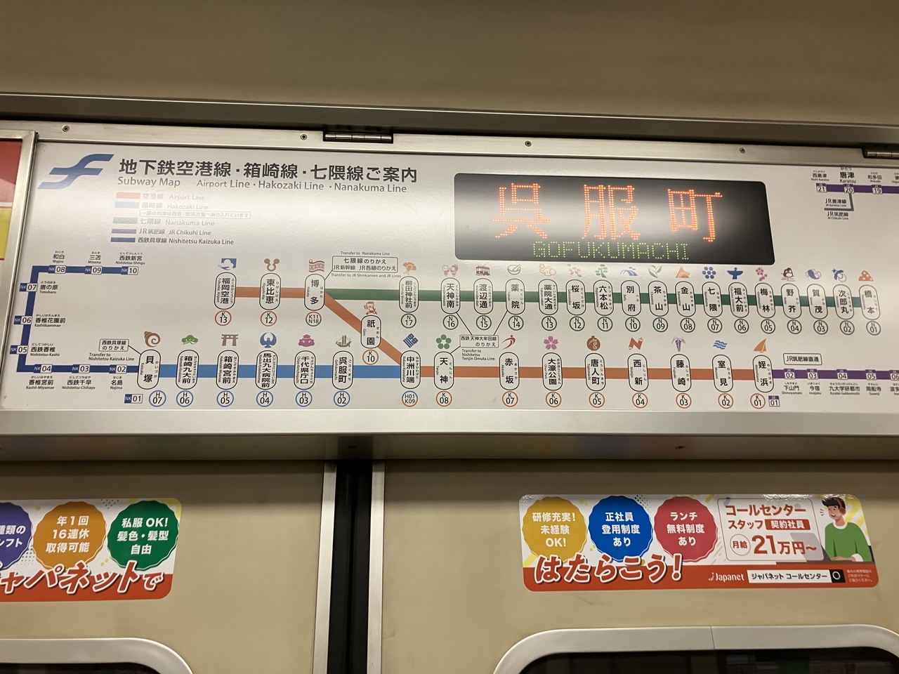 福岡市交通局の「中洲川端駅」と「貝塚駅」を結ぶ路線です。福岡県庁、九大病院方面へ走っています。貝塚駅では西鉄と接続します。今回は「呉服町駅」から「中洲川端駅」のみ乗車しました。ラインカラーはブルーで車両は空港線と同じでした。