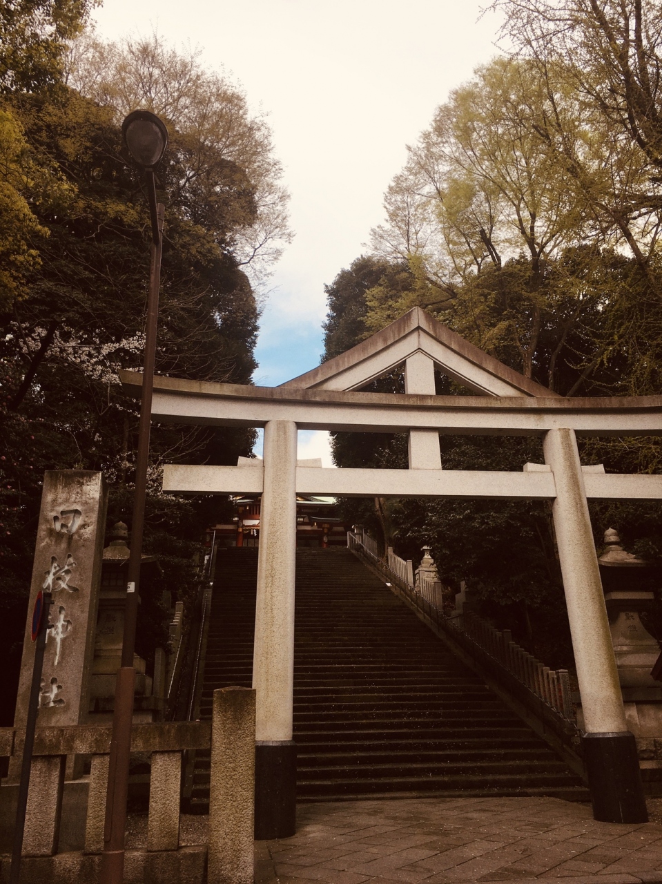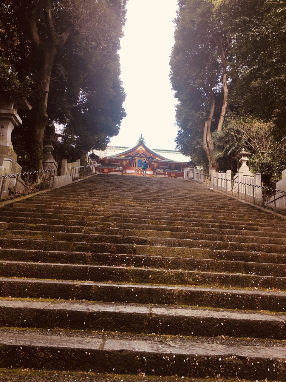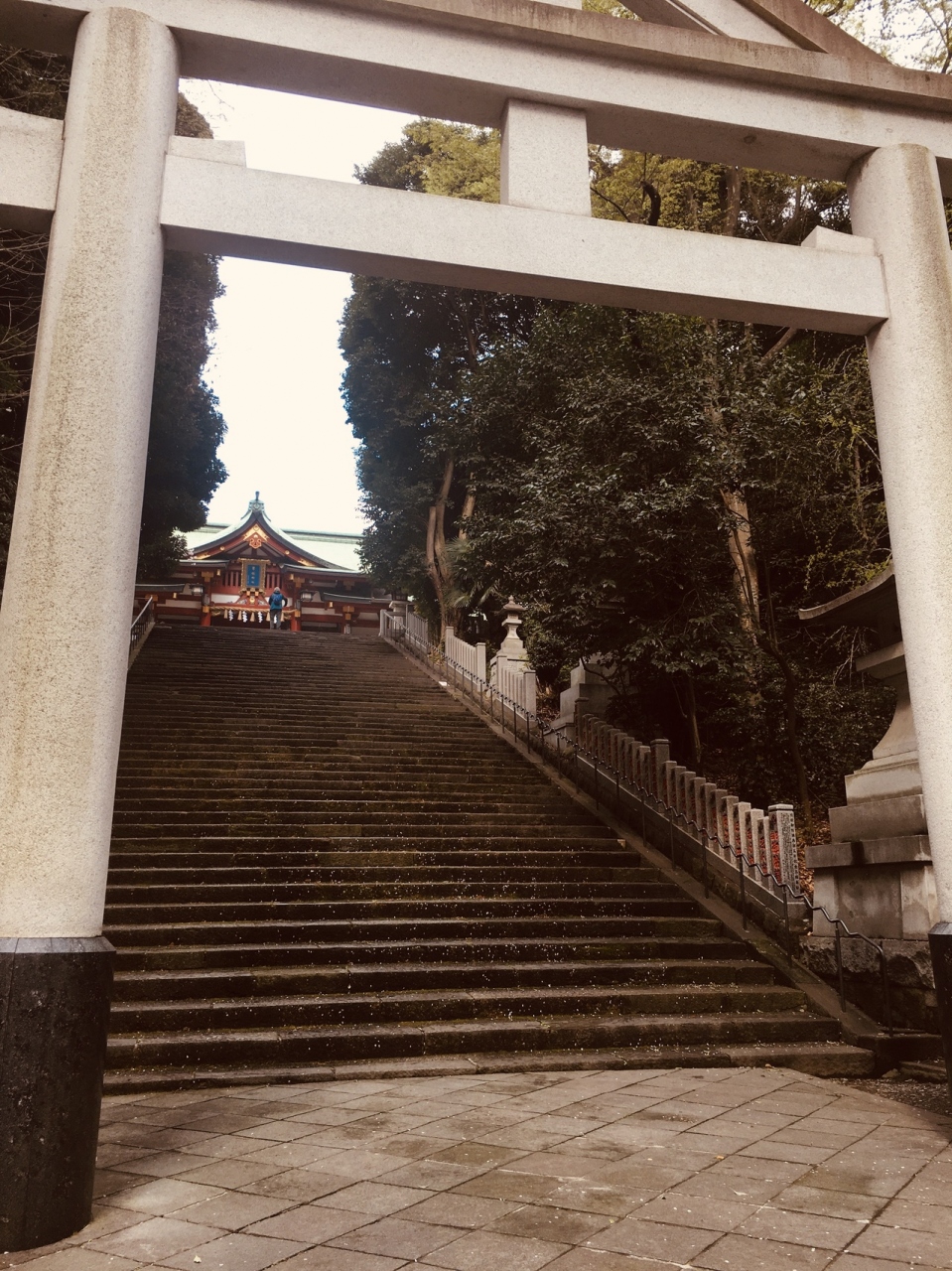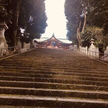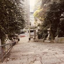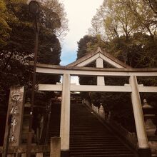 鳥居を潜ると階段があり、上までは1分ぐらいで上がれ、境内に入り正面には社殿がありました。幅は広めで左右に手すりがあり、その横は草木が生えて、灯籠もあり、神社らしい坂道でした。少し急な階段です。横には車も通れる女坂があります。