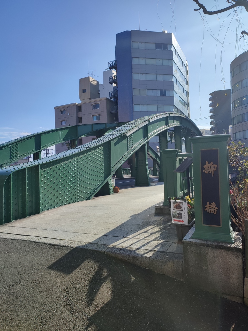 神田川にかかる橋で、隅田川に合流する直前にあります。わりとよくある名称で、この手の名所は実際に柳の木があったりしたことが多いですが、少なくとも名残らしいものは全然ないです。ただ、橋としては結構艶やかな色でした。