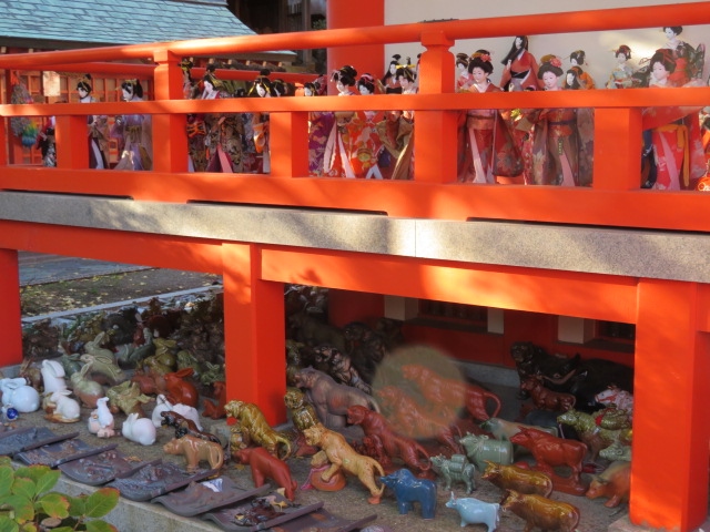 加太駅を下りて、あわしま街道を通って、街道の終点の淡嶋神社に到着しました。こちらの神社は、赤が鮮やかな華やかな神社です。それよりも目を引いたのが、本殿の欄干のある場所に人形がずらっと並んでいました。その下には、カエルが多かったですが、動物の置物がたくさん並ぶ愉快な神社でした。