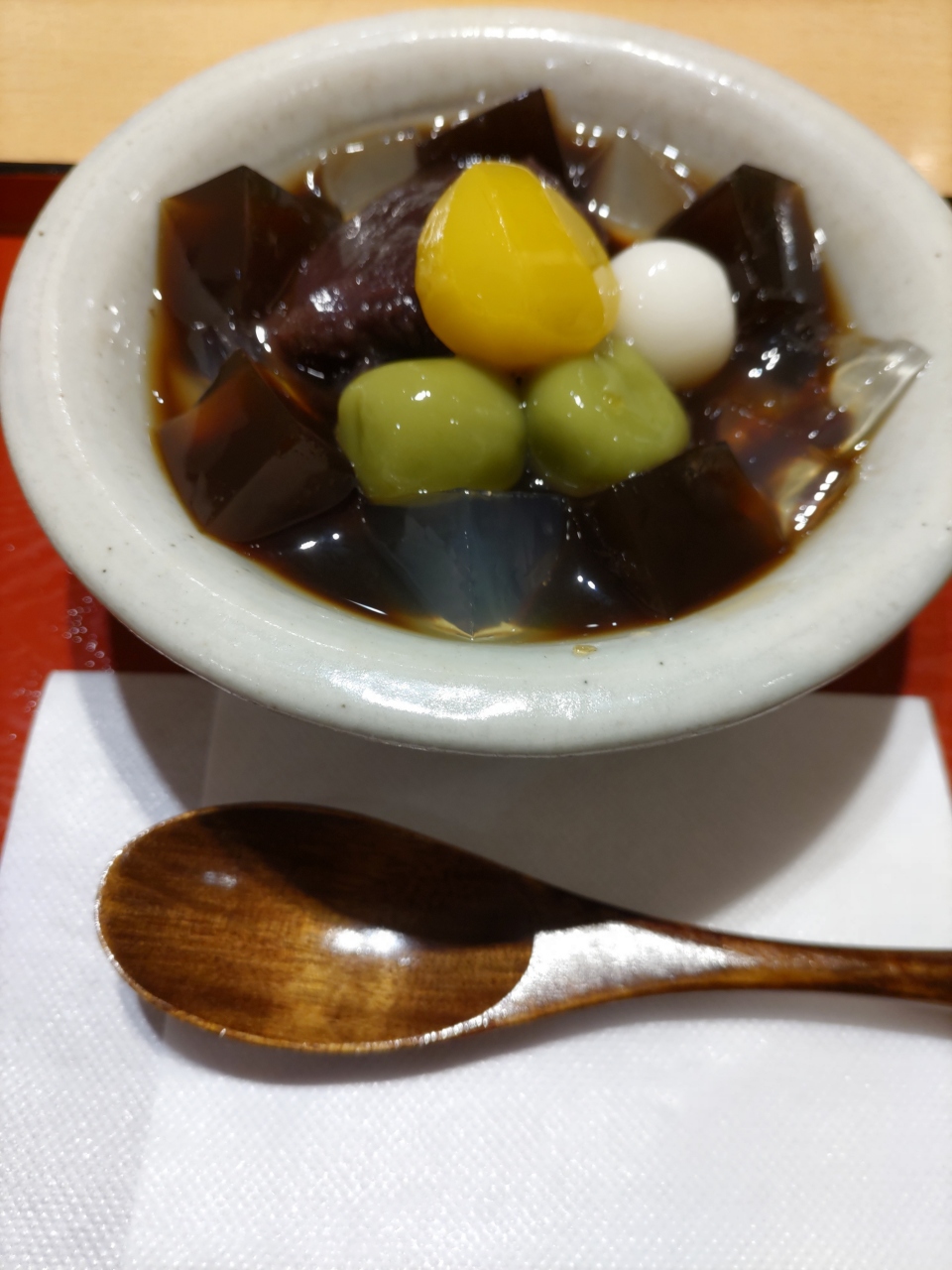 大通りに面してたくさんお店があり、観光客でいつもにぎわう通り。家傳京飴 祇園小石に立ち寄りました。八坂神社よりにあり、桜のシーズンなのでお店もにぎわっていて、抹茶パフェはすでに午後品切れ。あんみついただきました。飴屋さんなので飴もおいしい