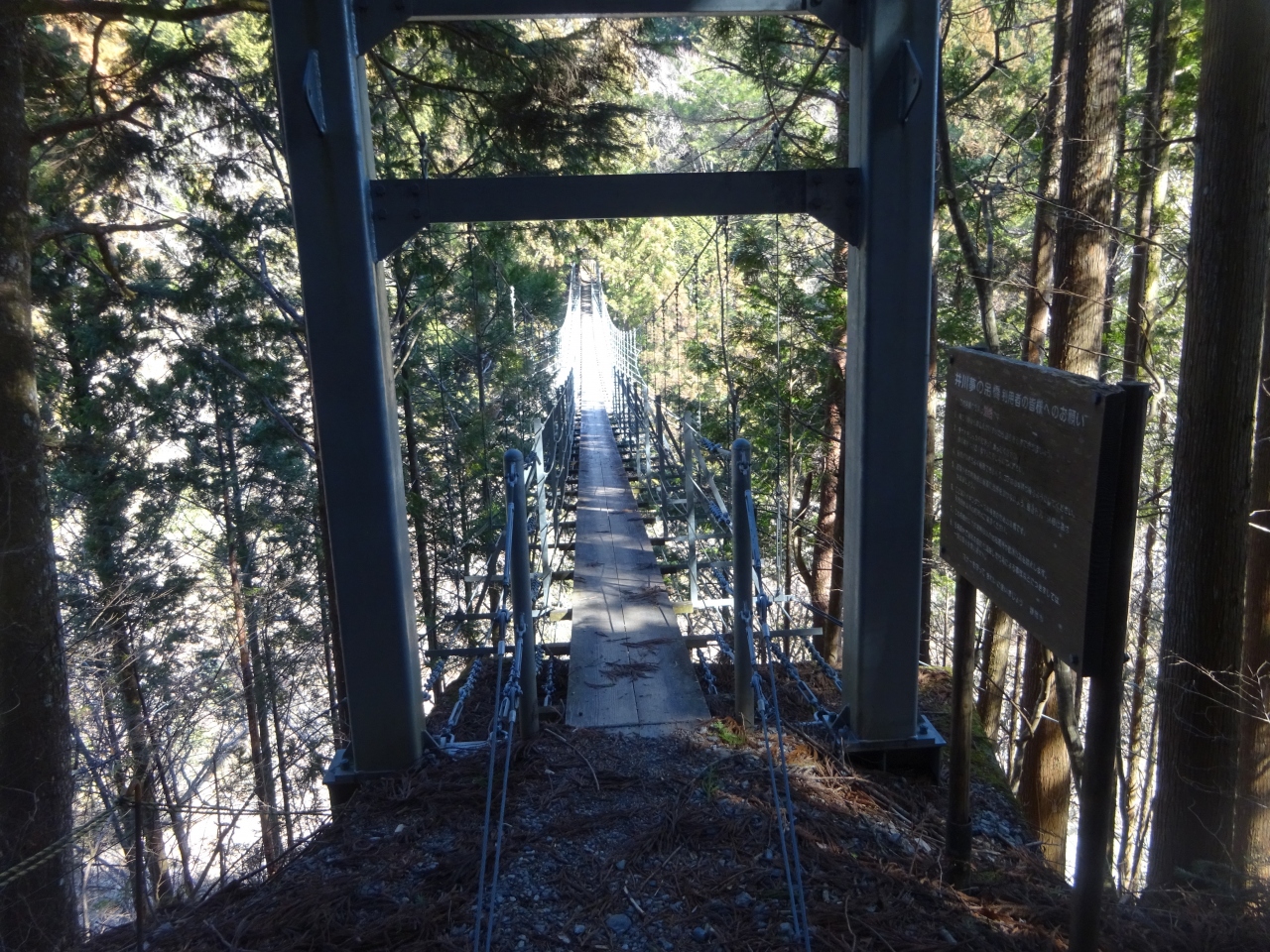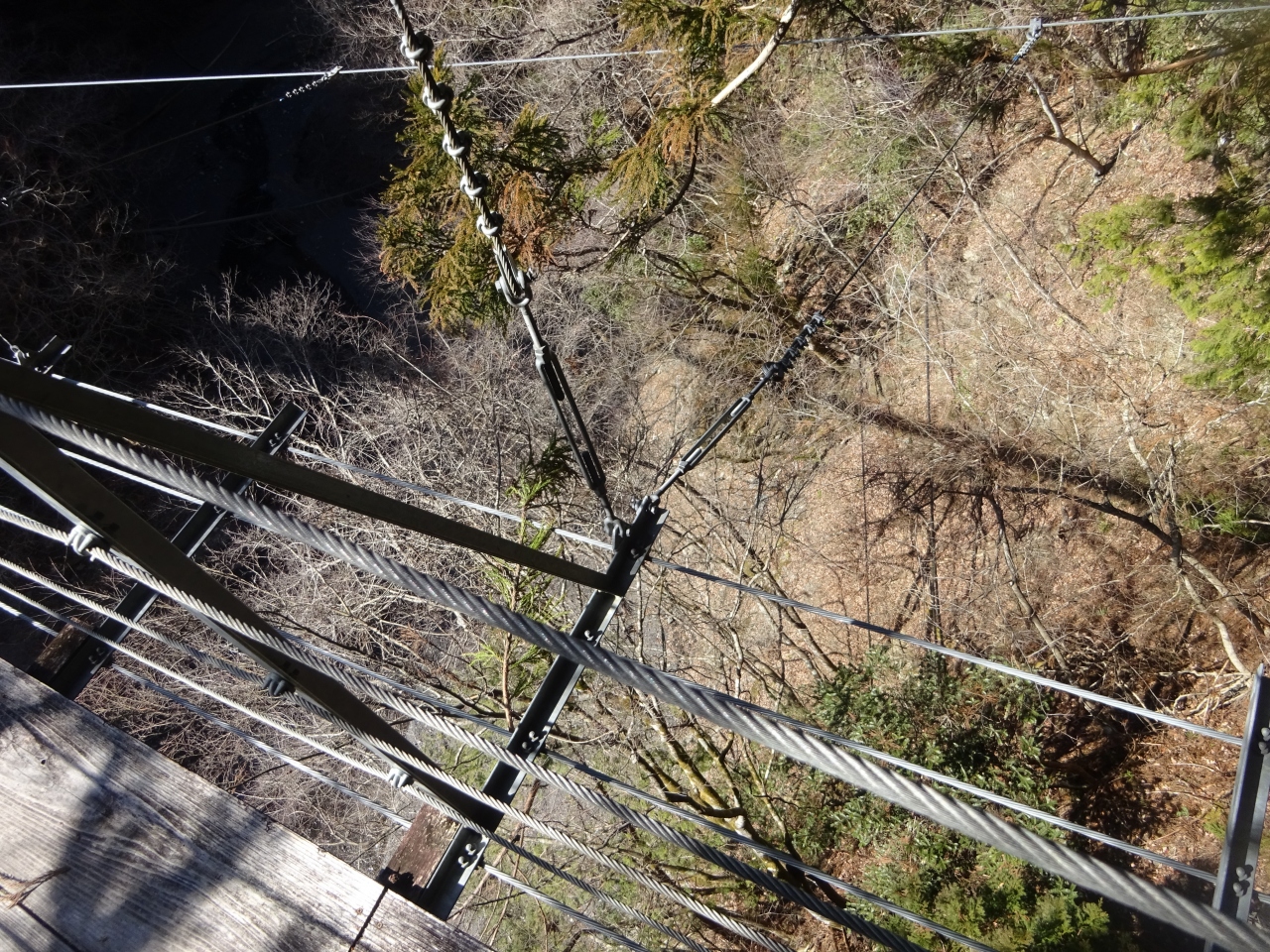車道からは急峻な坂を下ったところにあり、にもかかわらず川面からはかなり高く、踏板は狭く、下がスカスカで結構スリルがありました。定員は5名ということで、私が訪れたのは冬季だったので誰もいませんでしたが、観光シーズンなどは並ぶかもしれません。