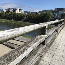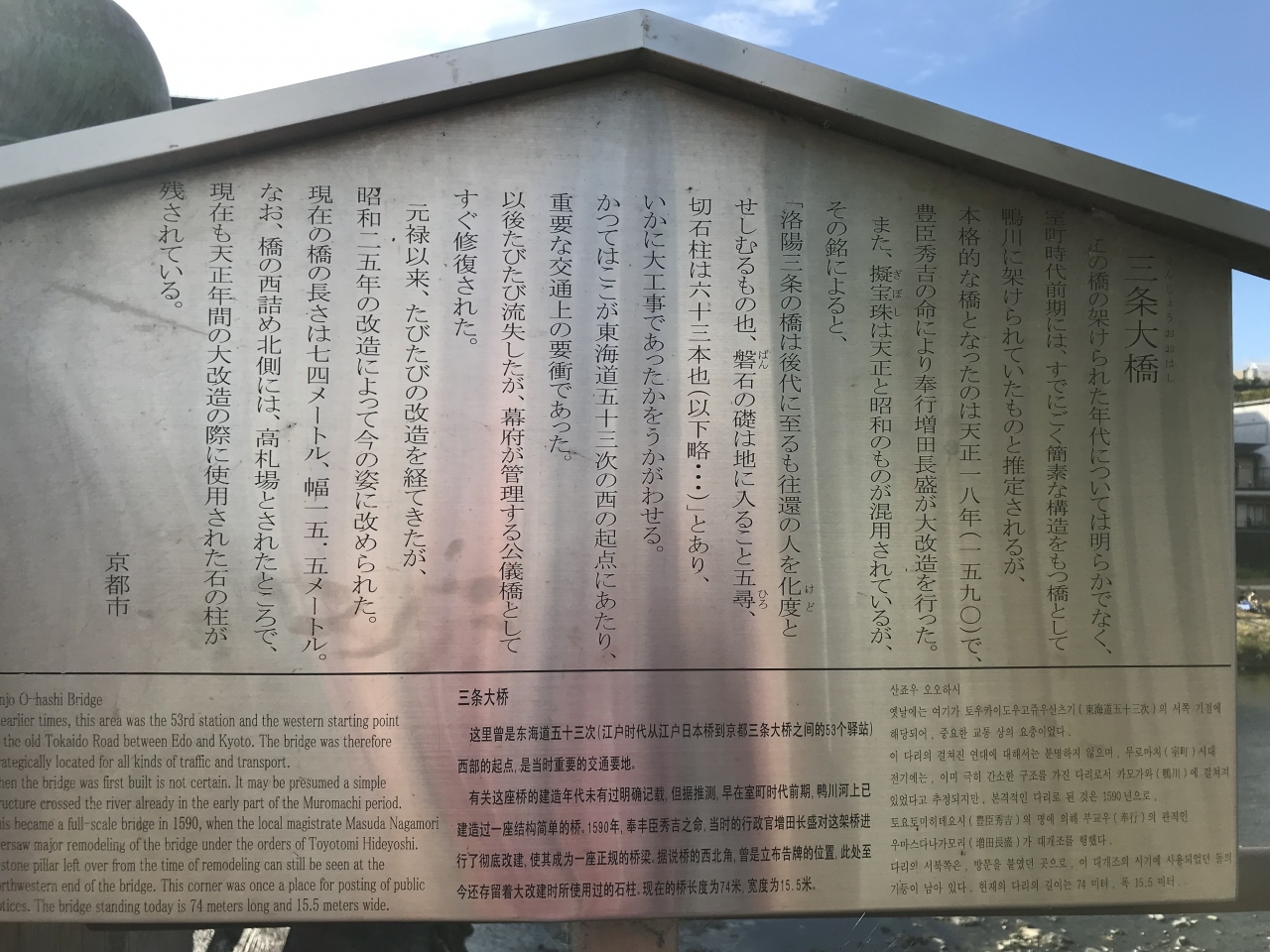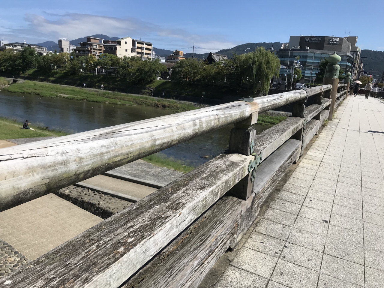 三条大橋は、三条通で鴨川に架かる橋です。江戸時代には東海道五十三次の起点になっていました。擬宝珠を冠した木造風の橋は、京都らしい風情を感じさせる橋です。現在の橋は改修されたものですが、豊臣秀吉が建設した当時の面影を残しつつ、擬宝珠にも一部当時のものが使われているそうです。京阪電車 三条駅から繁華街である河原町への通り道になっていて常に人通りが多い場所です。