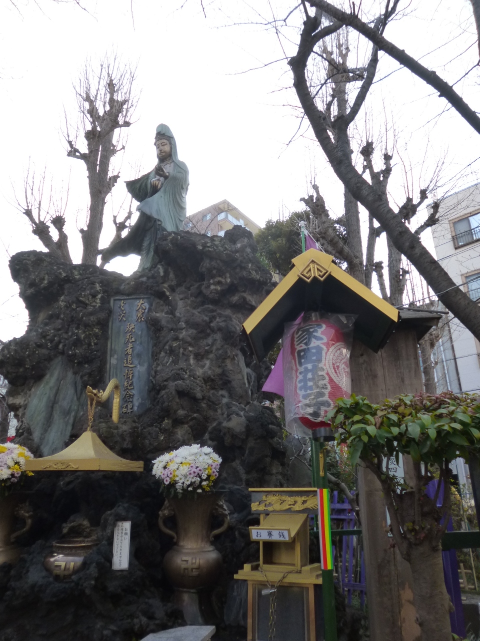 新吉原花園池跡が浅草寺から北へ17分ほど歩いたところにあります。もとはこの辺りは湿地帯で、幕府による吉原移転の際に造成され、この池の一部が残ったようです。敷地の中央部池の畔の築山に観音様が立っています。関東大震災では多くの人々がこの池に逃れ、490人が溺死するという大きな悲劇が起来たそうです。その慰霊のために置かれた観音様です。