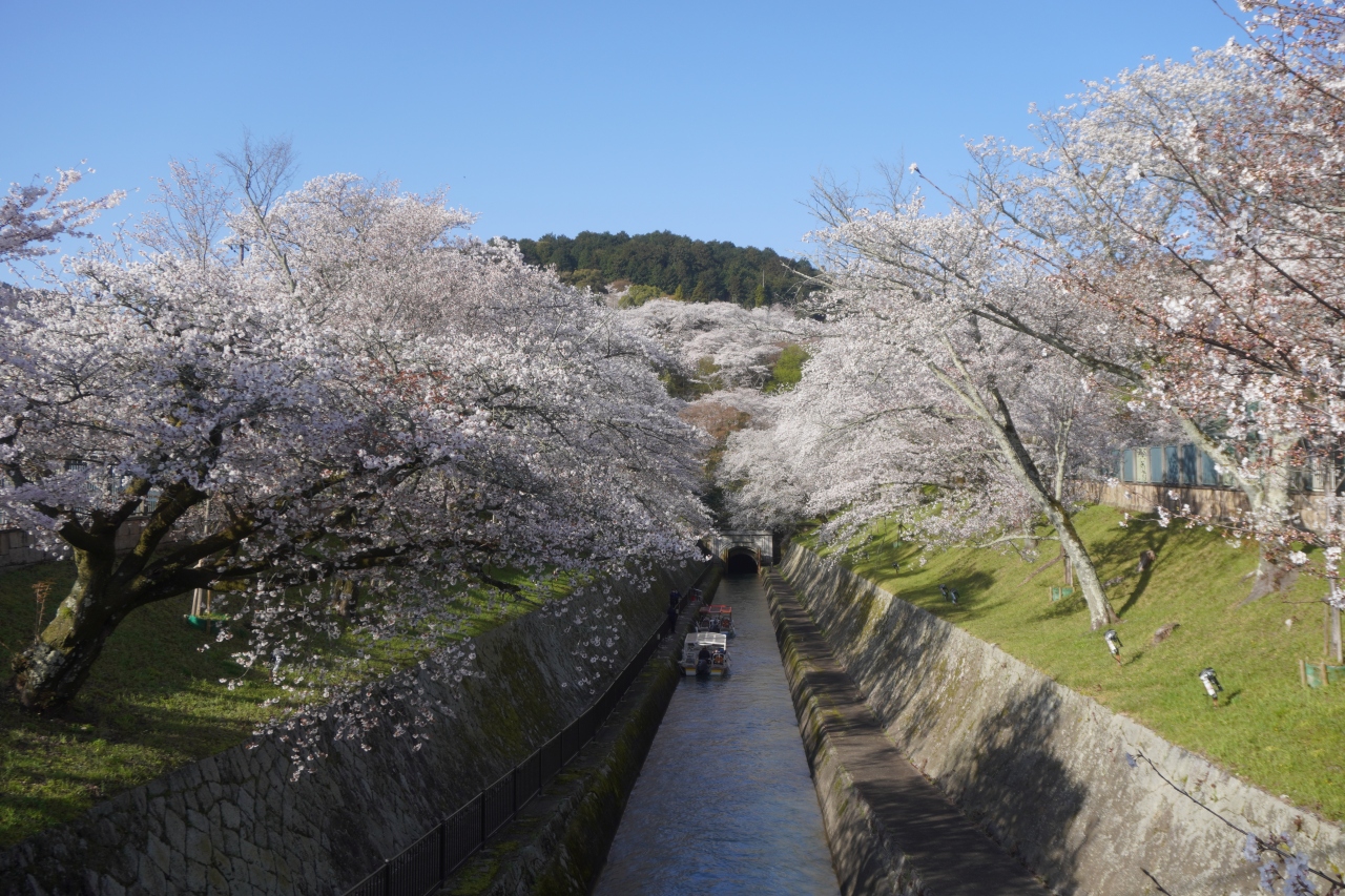 琵琶湖疏水は桜の名所ですが、三井寺に向かう途中に通ることになるので効率がいいですね。山のトンネルに向かって一直線に伸びる疎水の両脇には桜の並木が続いていて、ネットの情報とかでもよく見るそのままの眺め。サプライズ感はあんまりないように思います。