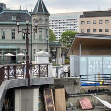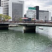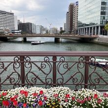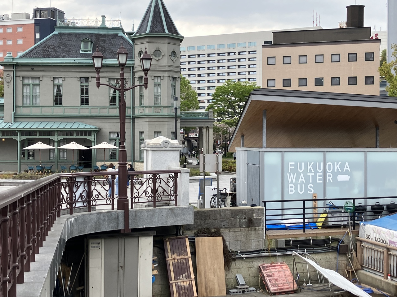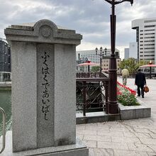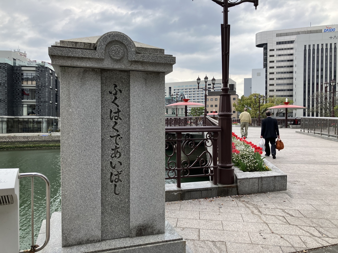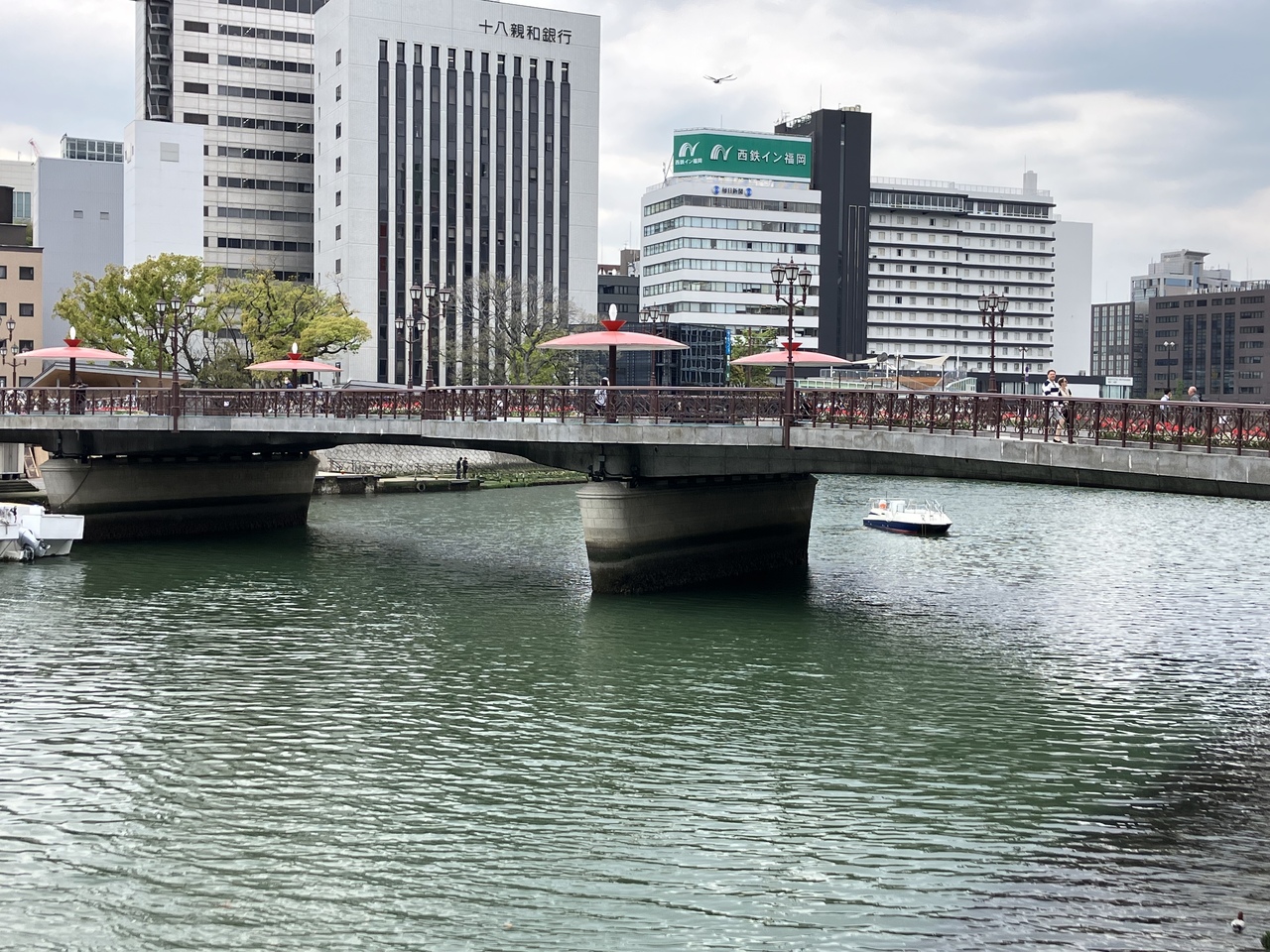 福岡市営地下鉄空港線「天神駅」から徒歩で5分ほどです。武士の町「福岡」と商人の町「博多」の境を流れる那珂川に架かる橋で両者が出会う橋という意味で付けられた名前です。歩行者専用の端には花壇やガス灯、そしてベンチに掛かるパラソルは福岡民謡「黒田節」の盃と槍をイメージしたものだそうです。なるほど!