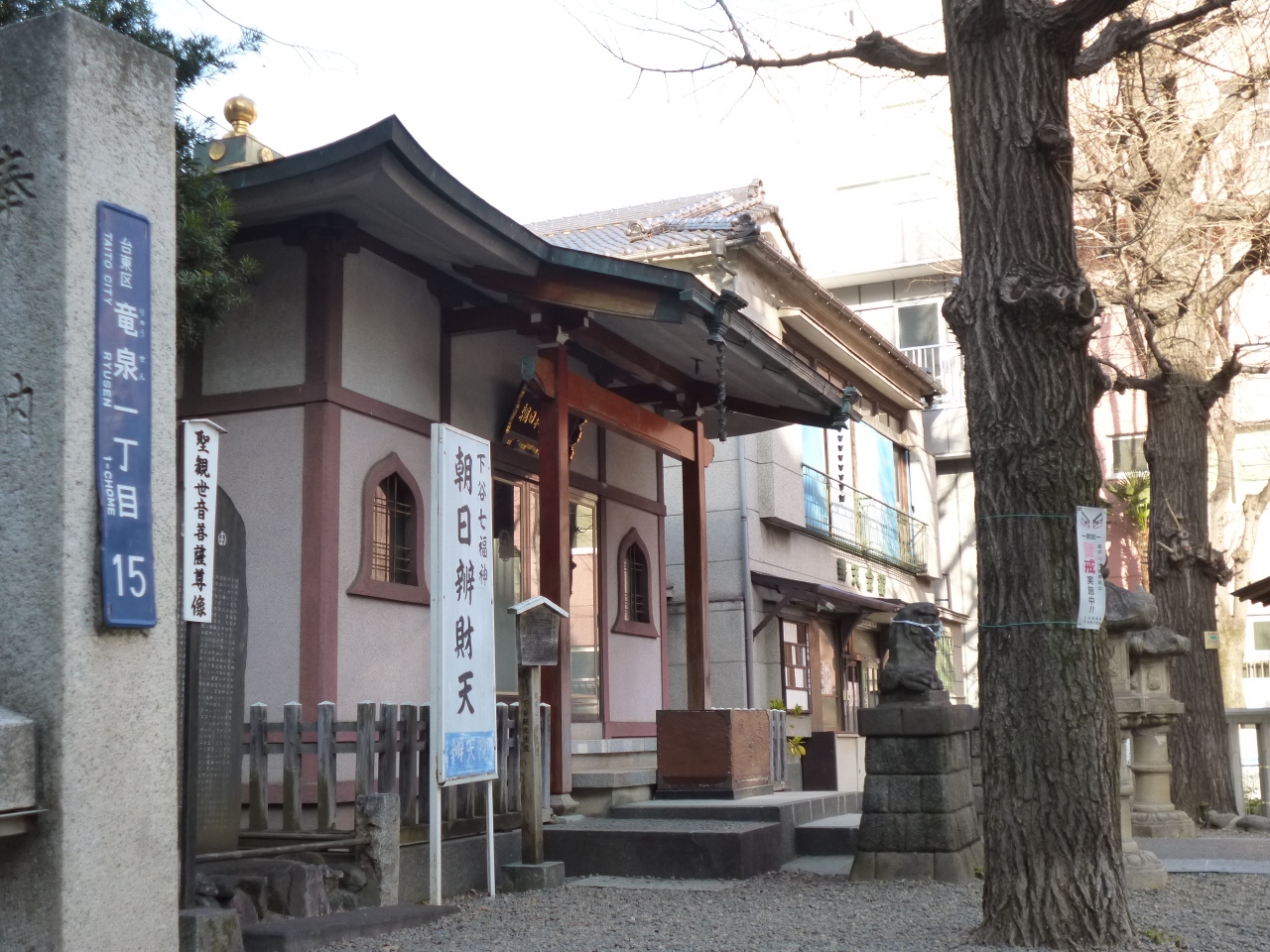 浅草の近く、入谷駅と三ノ輪駅のちょうど真ん中辺りにある公園内にあります。訪れた時も子供たちが元気に公園で遊んでいました。常陸下館藩主が寛永寺の不忍池辯天堂を創建する時にも自分の江戸下屋敷にも勧請したのが始まりだそうです。不忍池辯天堂は、谷中七福神の辯才天を祀っていて、ここ弁天院は下谷七福神の弁財天となっているそうです。