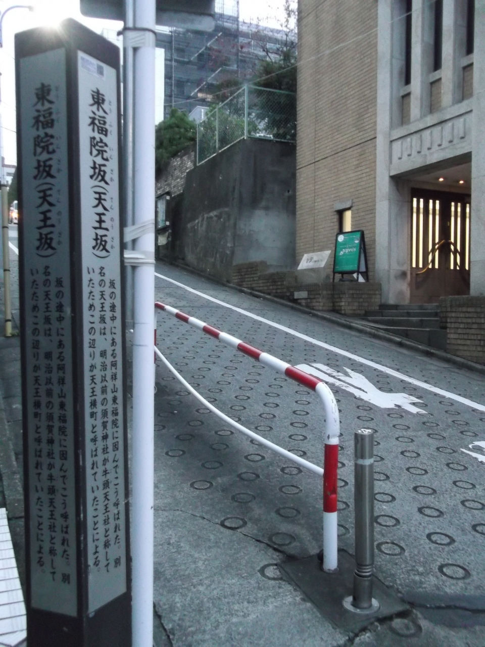 丸ノ内線四谷三丁目駅から新宿通りを四ツ谷駅方向に歩いて5分ほど、四谷二丁目信号前から須賀神社へ向かう途中にある坂道です。長さは50メートルほどですが、かなりの勾配なので上る場合は結構きつそうです。坂の両側には、この坂の名前の由来になっている東福院のほか、いくつかの寺院が並んでいます。