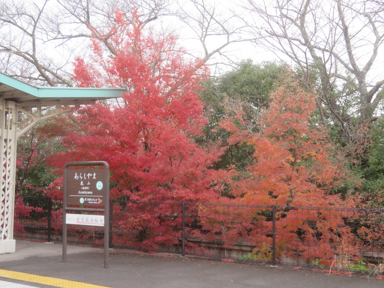 阪急京都線の桂駅で乗り換えてすぐです。今回は、嵐山で紅葉を見学しようとやってきました。来てみてびっくりでした。「あらしやま」と書かれた看板の背景の紅葉がとても奇麗でした。嵐電の嵐山駅に比べると、アクセスが悪いのが難点ですね。