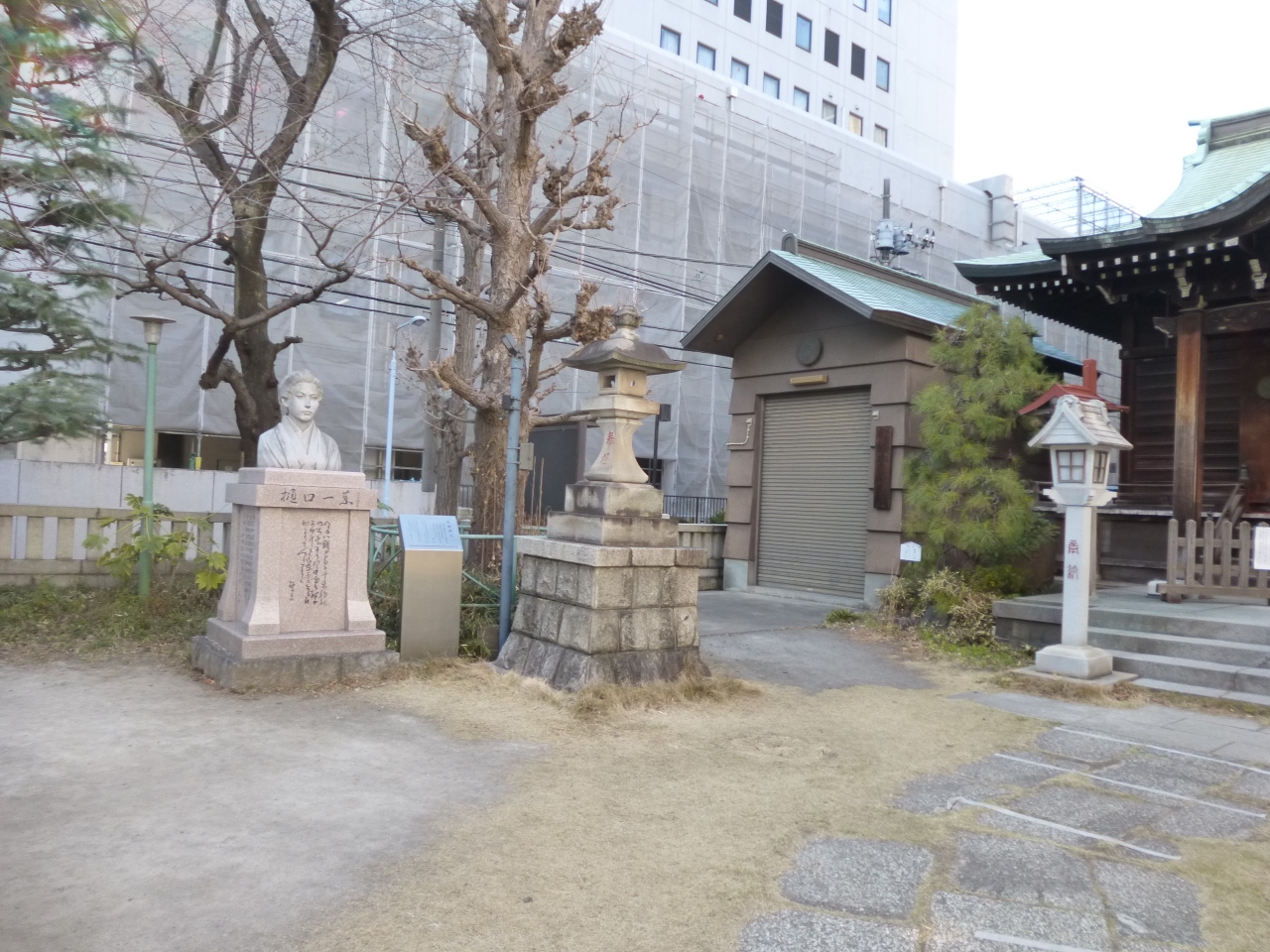 三ノ輪駅から南に5分ほどのところに千束稲荷神社がります。入り口付近の案内や、境内にある樋口一葉の像からここが樋口一葉ゆかりの神社、特に代表作「たけくらべ」にゆかりの深い神社であることがわかります。創建は不祥だそうですが、鳥居は1813年の建立で柱には江戸後期の書家の書が 刻まれています。