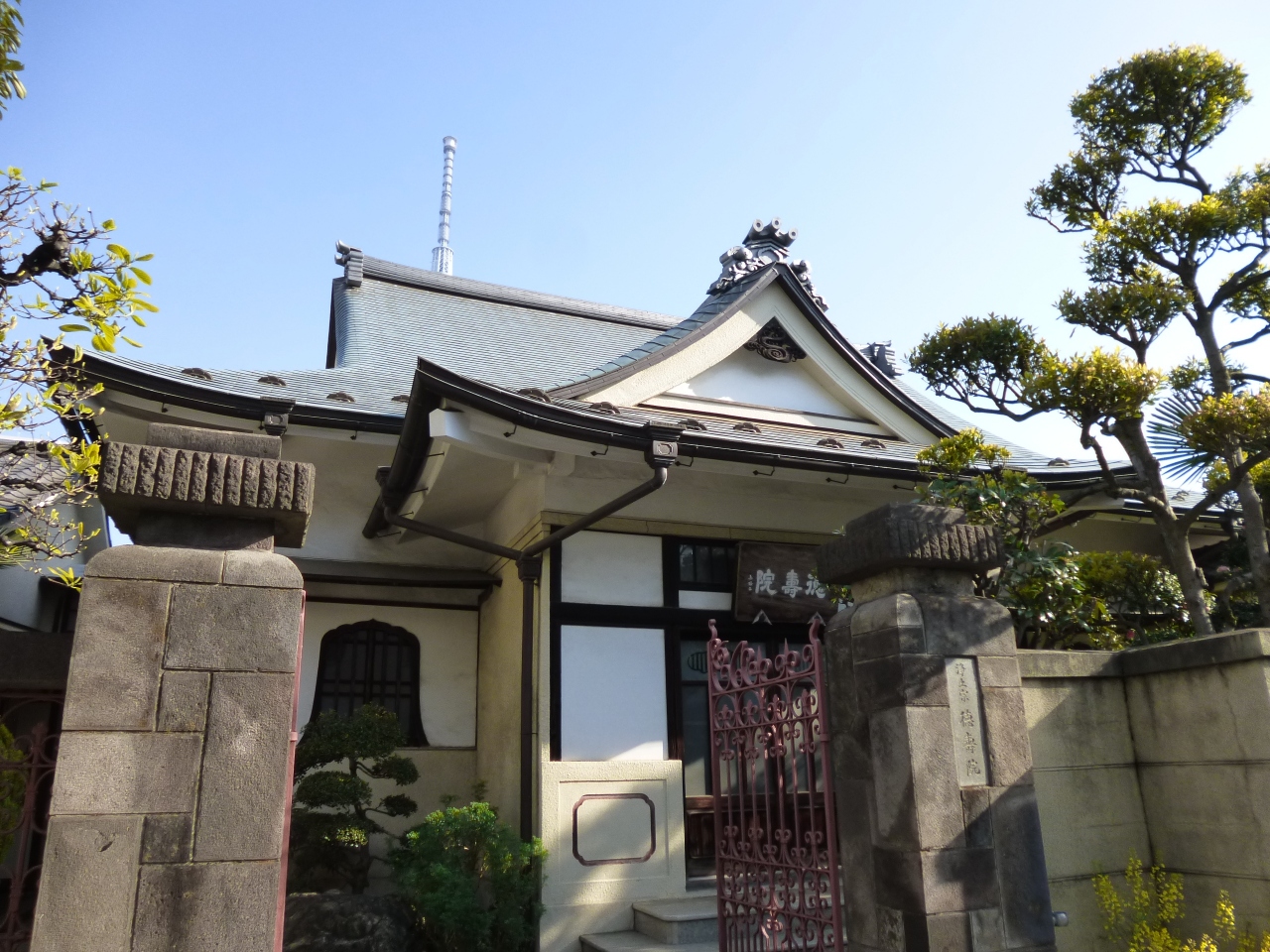 墨田区横川1丁目にある浄土宗寺院です。小さなお寺で本堂の南側に山門があり、山門入るとすぐ本堂があります。境内は狭いながらも緑豊かで、木々の緑が本堂の白壁を際立たせていました。白壁に埋め込まれている花頭窓も印象的です。また、屋根の向うにはスカイツリーの先端部分が見えていました。