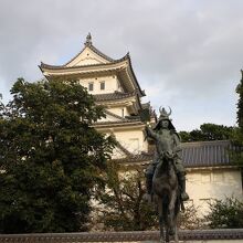 市民憩いの公園に勇ましい武将の像 そしてバックに大垣城