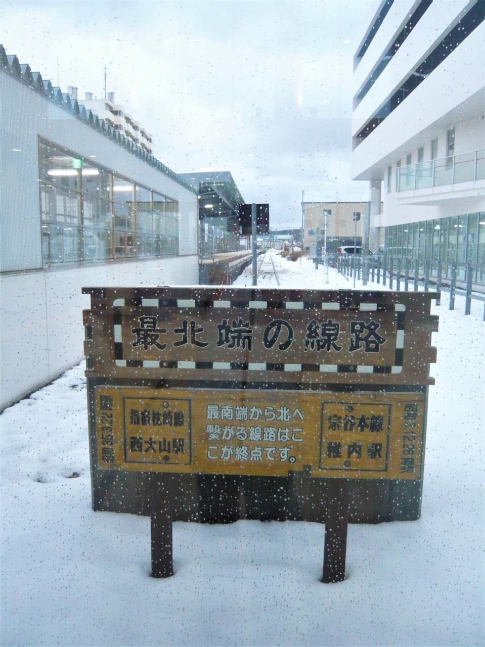 JR稚内駅の線路の車止めの背後には”最北端の線路”と木製看板がガラス越しに立っています。