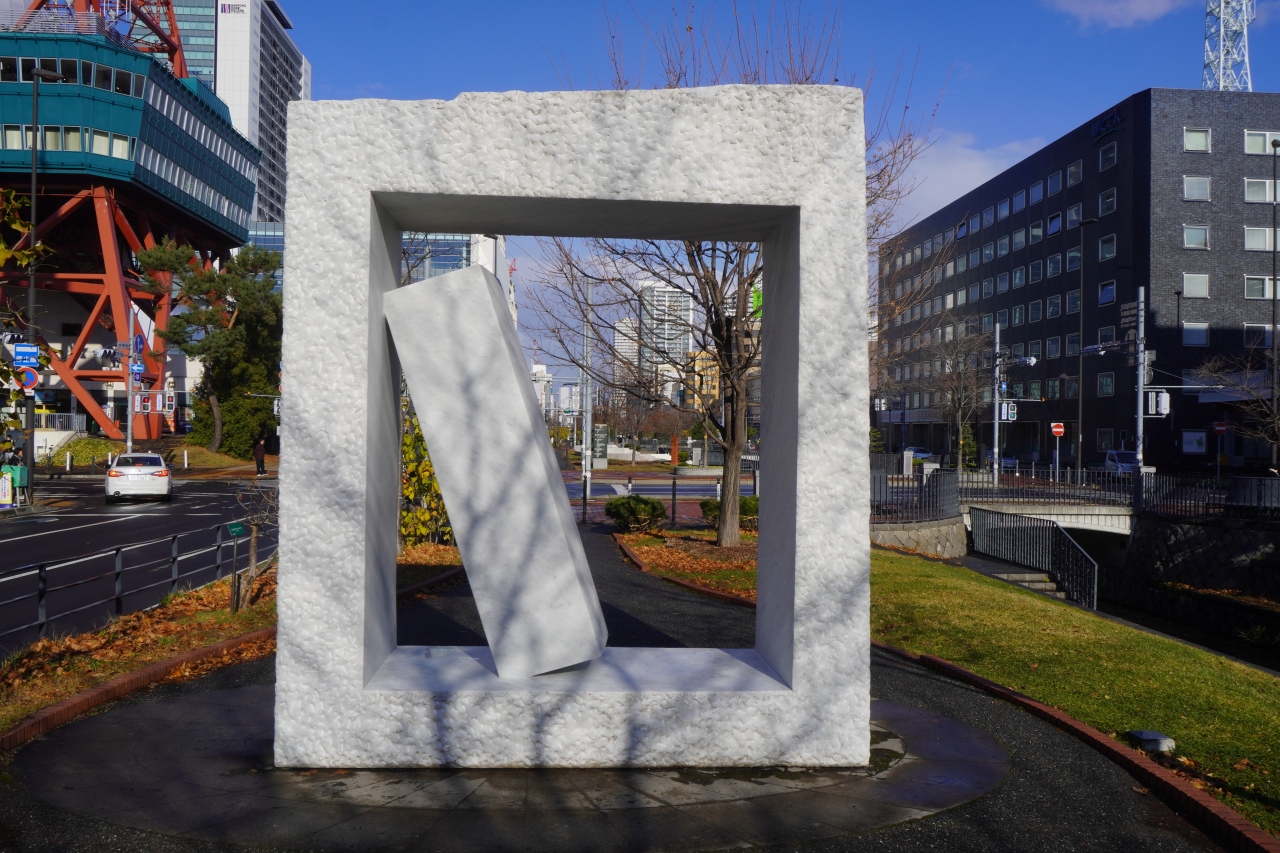 創成川公園にある野外彫刻「生棒」は、「生誕」「天秘」とともに、北海道美唄市出身の彫刻家、安田侃氏の作品。四角く切り取られた窓の中に石柱が立て掛けてあるもの。この石柱が意味するものが何かなんでしょうが、「生棒」の名前と合わせると男性を表しているのかも。そうすると「天秘」は女性かな。「生誕」にもつながるかもしれません。