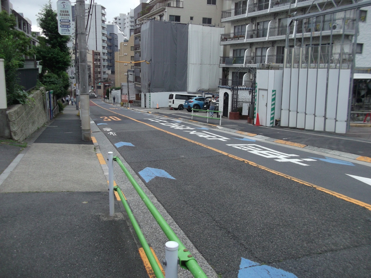 JR三田駅から歩いて7分ほど、慶応大学正門の少し手前から始まる長い坂道です。勾配はそれほど急ではありませんが、数百メートルに渡って延々と続くのでずっと歩いて行くと疲れそうです。道の両側はマンションが多いですが、途中には緑もある亀塚公園や三田台公園もあります。