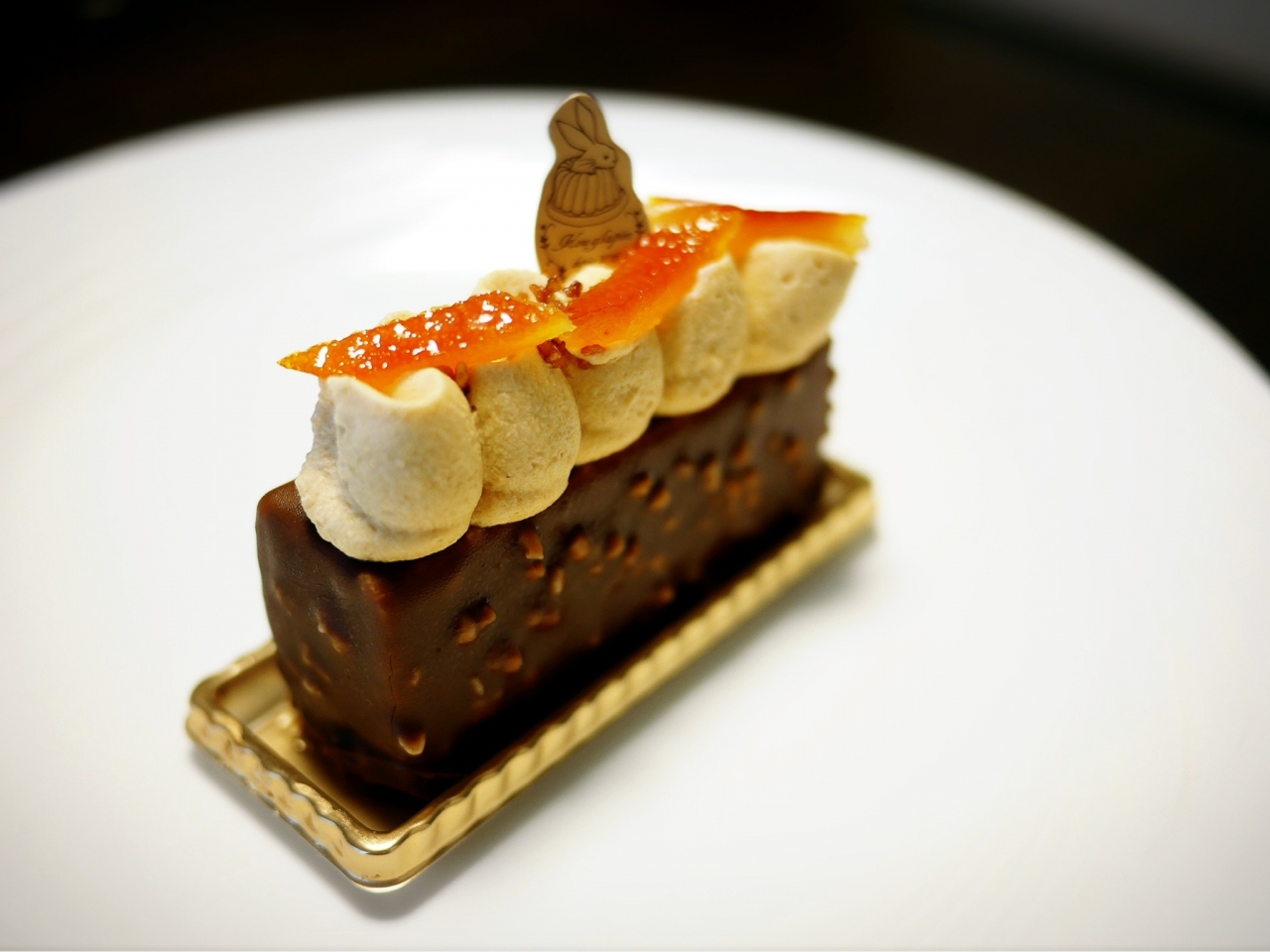---キャラメル生地にヘーゼルナッツとオレンジのバタークリーム、キャラメルシャンティ―の構成です。チョコとオレンジの組み合わせは定番ですけど、安定した美味しさです。