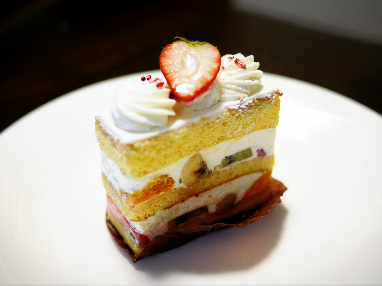 ---今回もフルーツのショートケーキを購入しました。生クリームが軽くて、舌の上でスーッと溶けていく上質さで、クオリティーが高いです。スポンジ生地と生クリームに挟まれたフルーツは、キウイ、バナナ、いちご、みかん等。