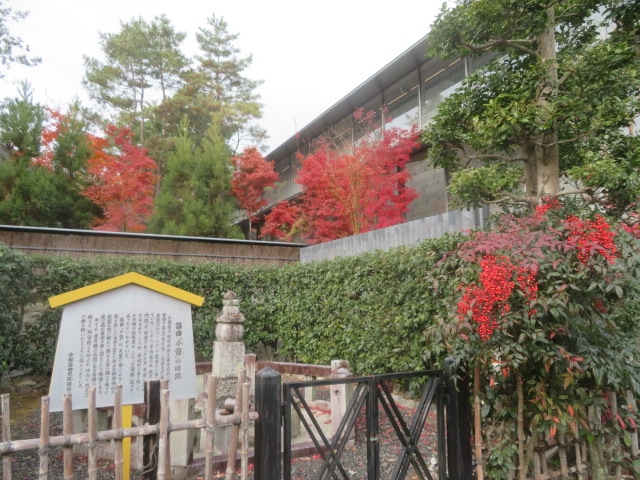 渡月橋を渡ってすぐの場所にある福田美術館の敷地にあります。こちらは、謡曲「小督」の旧跡です。謡曲「小督」は、小督局を巡る恋の話です。六角形の柵に囲まれたお墓らしき場所で、背後の紅葉が伝説を盛り上げる役目をしていますね。