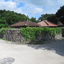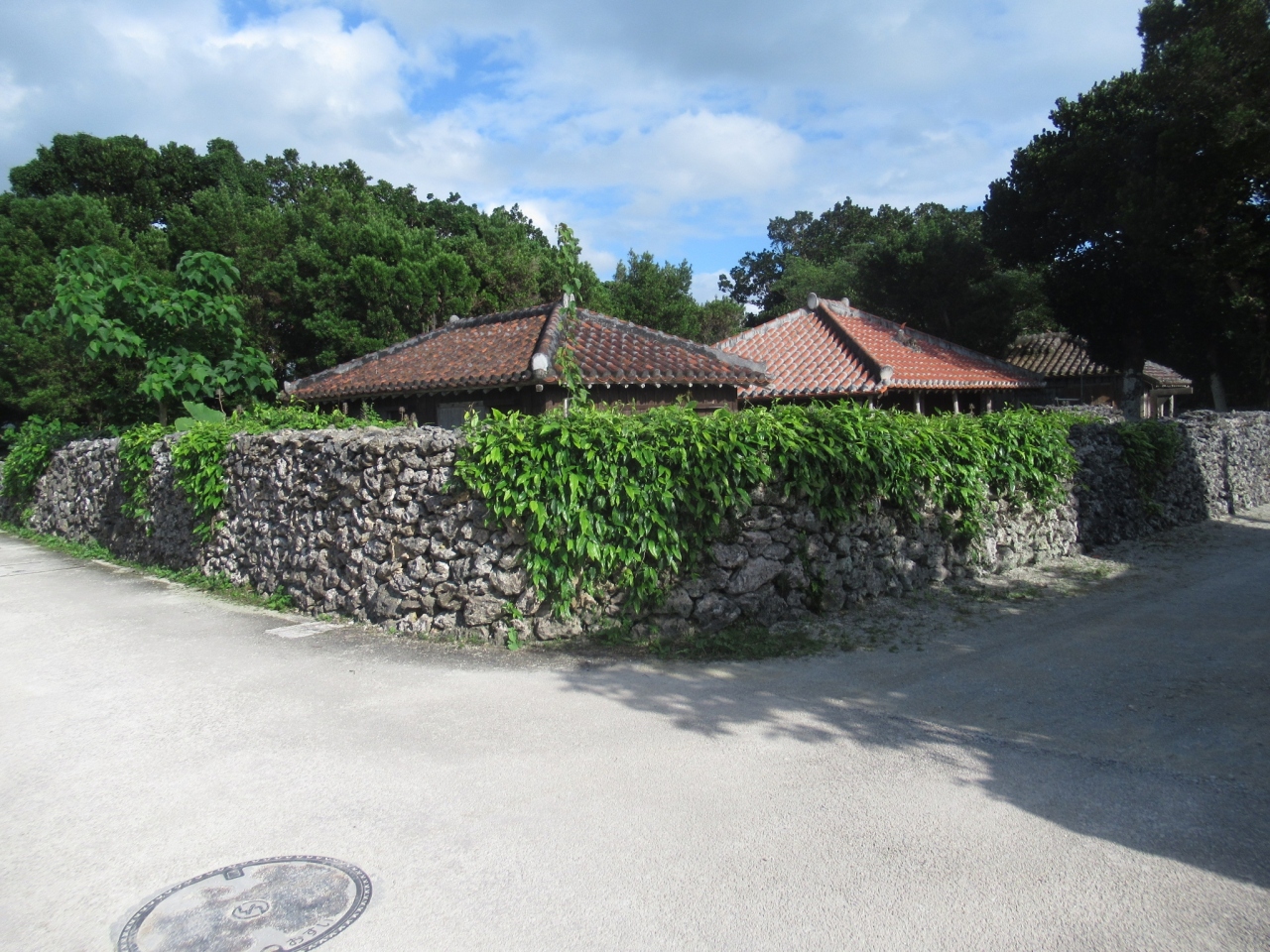 赤茶けた瓦が美しい屋根があり、石垣がサンゴで出来ていて、前の道が白くきれいです。