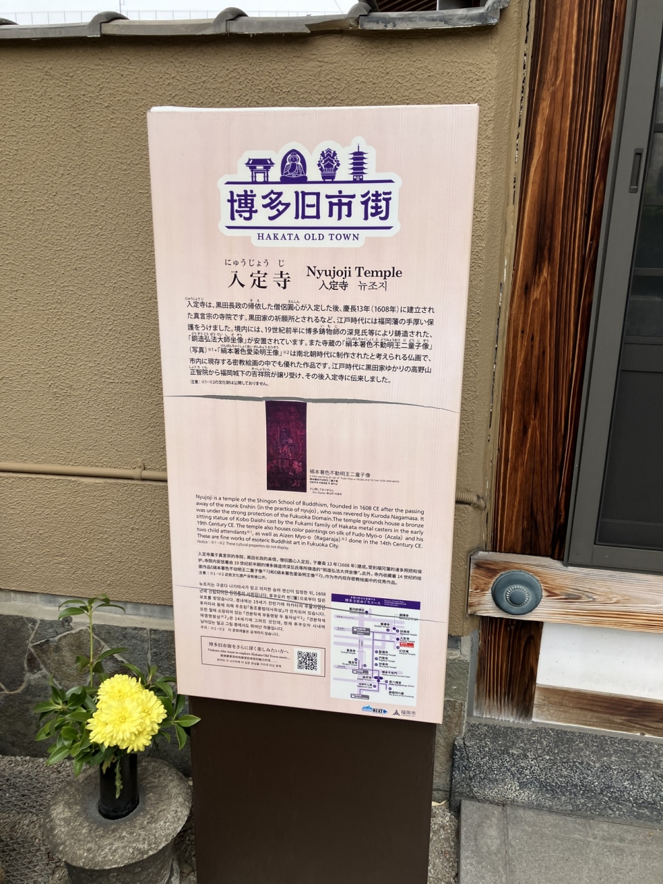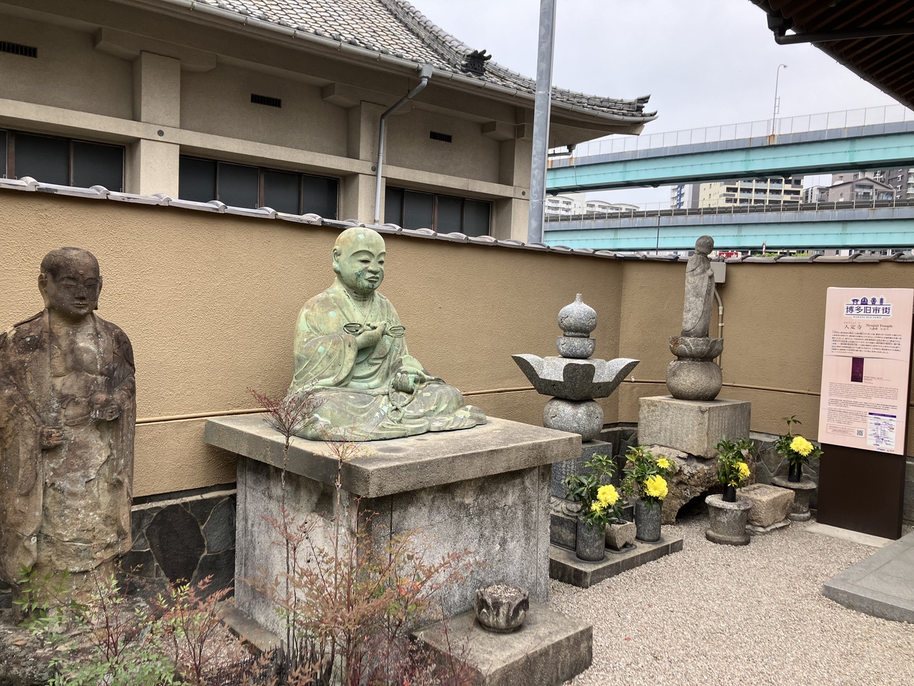 福岡市営地下鉄箱崎線「呉服町駅」から徒歩で10分ほどです。真言宗の寺院で本堂脇に19世紀前半に博多の鋳物師の深見氏等による「銅造弘法大師座像」が祀られています。黒田長政とも縁が深く黒田家の祈願所でもあります。また当寺は裏千家茶道教場として知られ福岡の裏千家の草分けでもあります。