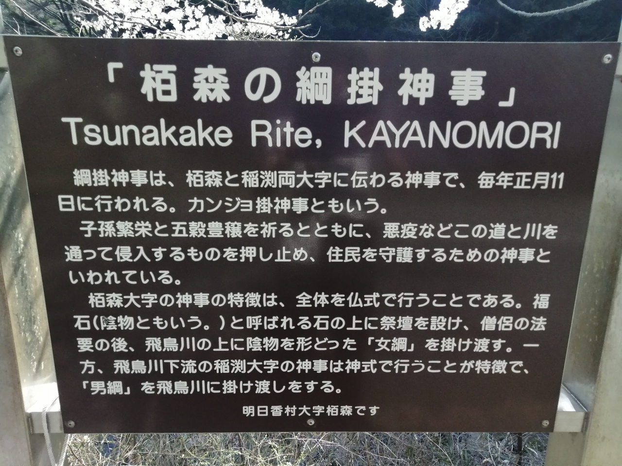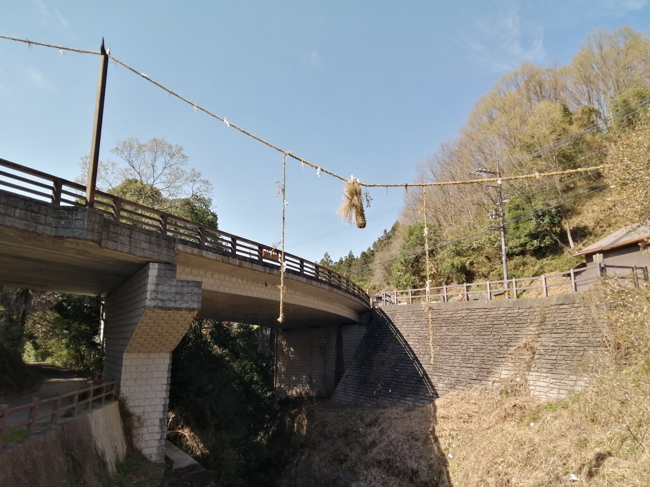 奥明日香、稲渕集落に伝わる綱掛神事で使用される勧請綱です。集落入口の明日香川に架かる勧請橋近くに男性器を模した稲藁が吊り下げられています。そしてとなりの栢森集落の明日香川に吊られているのが女綱。女性器を模した藁です。男綱と女綱で一対となっています。どちらもただ眺めるにはどおってことのない代物ですが、やはり見る価値があるのは毎年1月11日に行われる取り替え神事でしょうか。