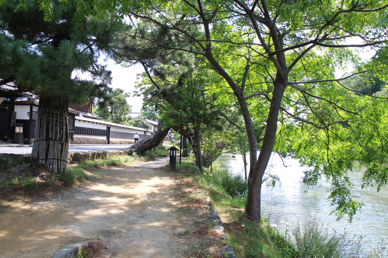 武家屋敷が江戸時代の姿のまま建ち並んでいて お堀側の道には松がある