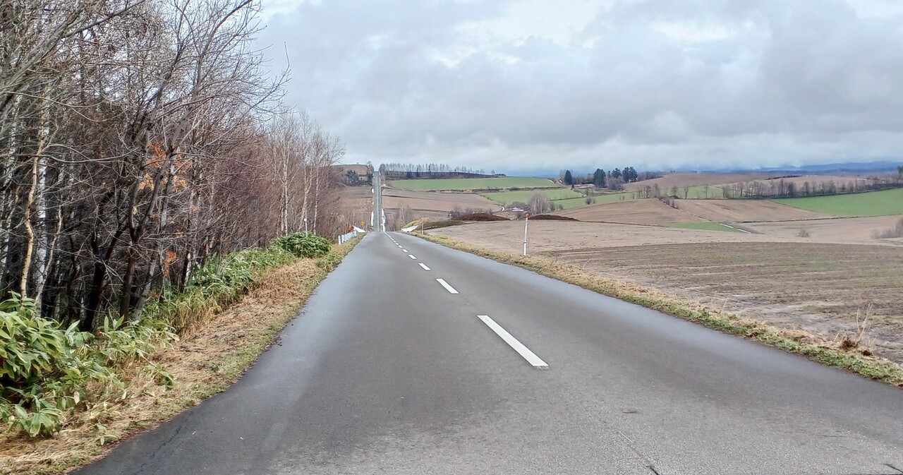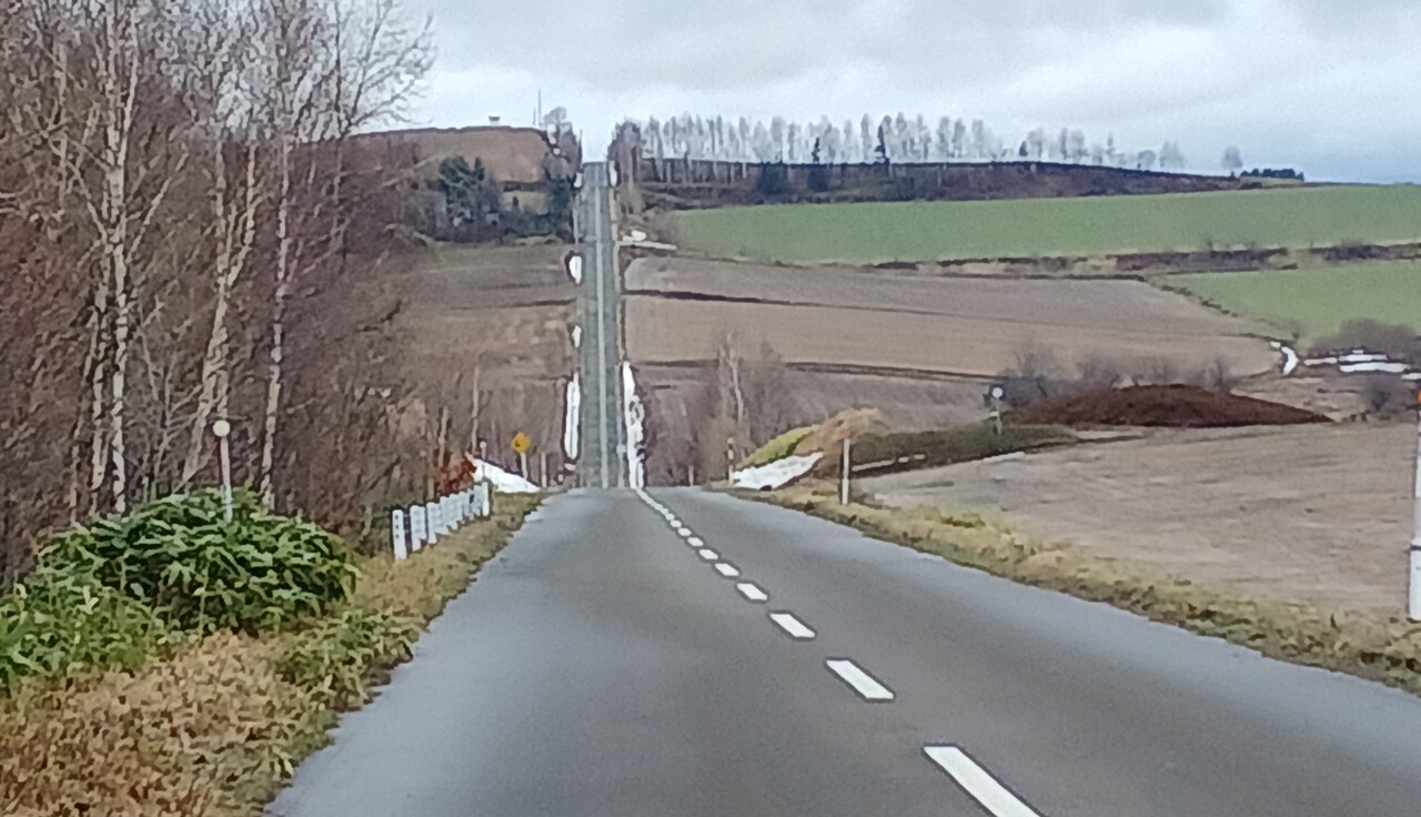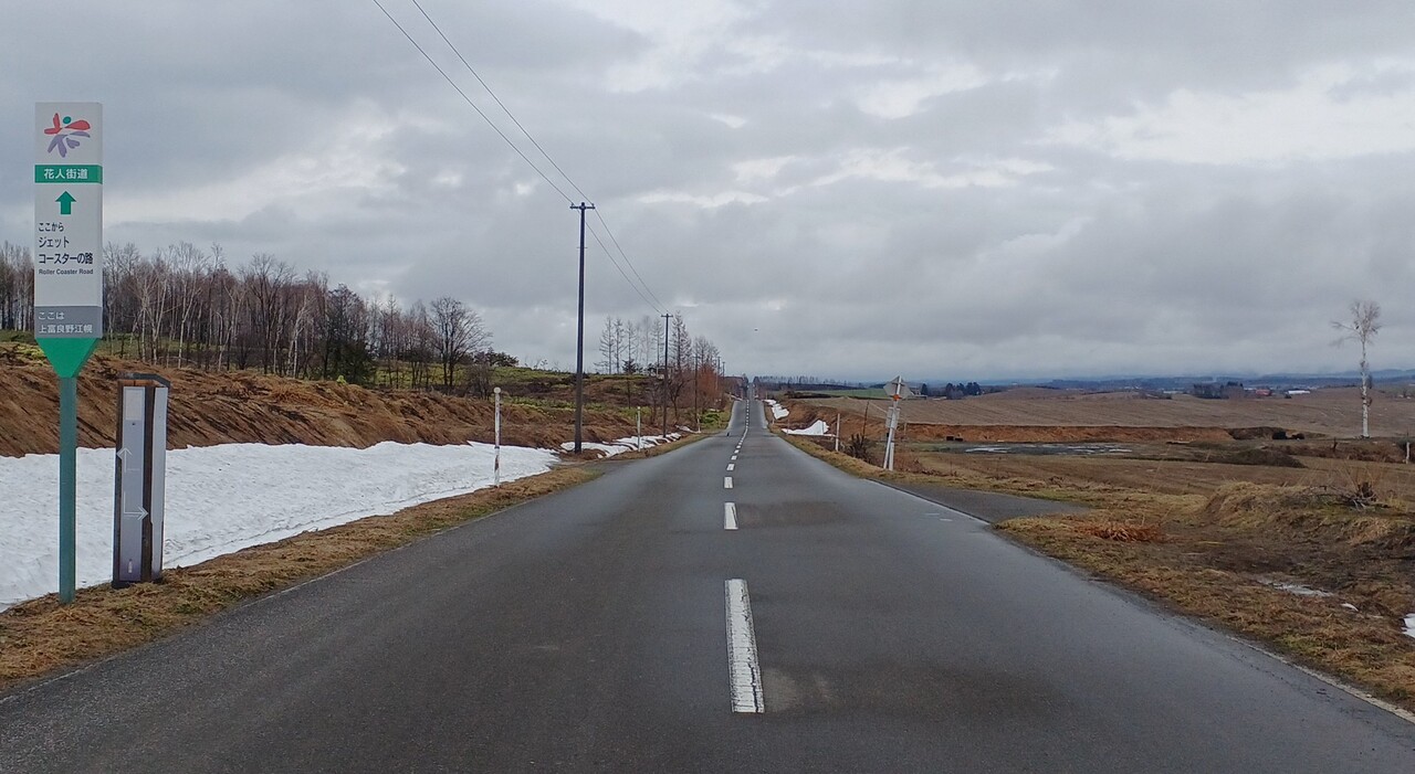 美瑛~富良野辺りを訪れた際は必ず走るジェットコースターの路。(土)の8時半過ぎは雨上がりの日だったからか、他の車は1台もいなく快適に走行できた。美瑛方面から国道237沿いの看板は小さく見えづらいかな。